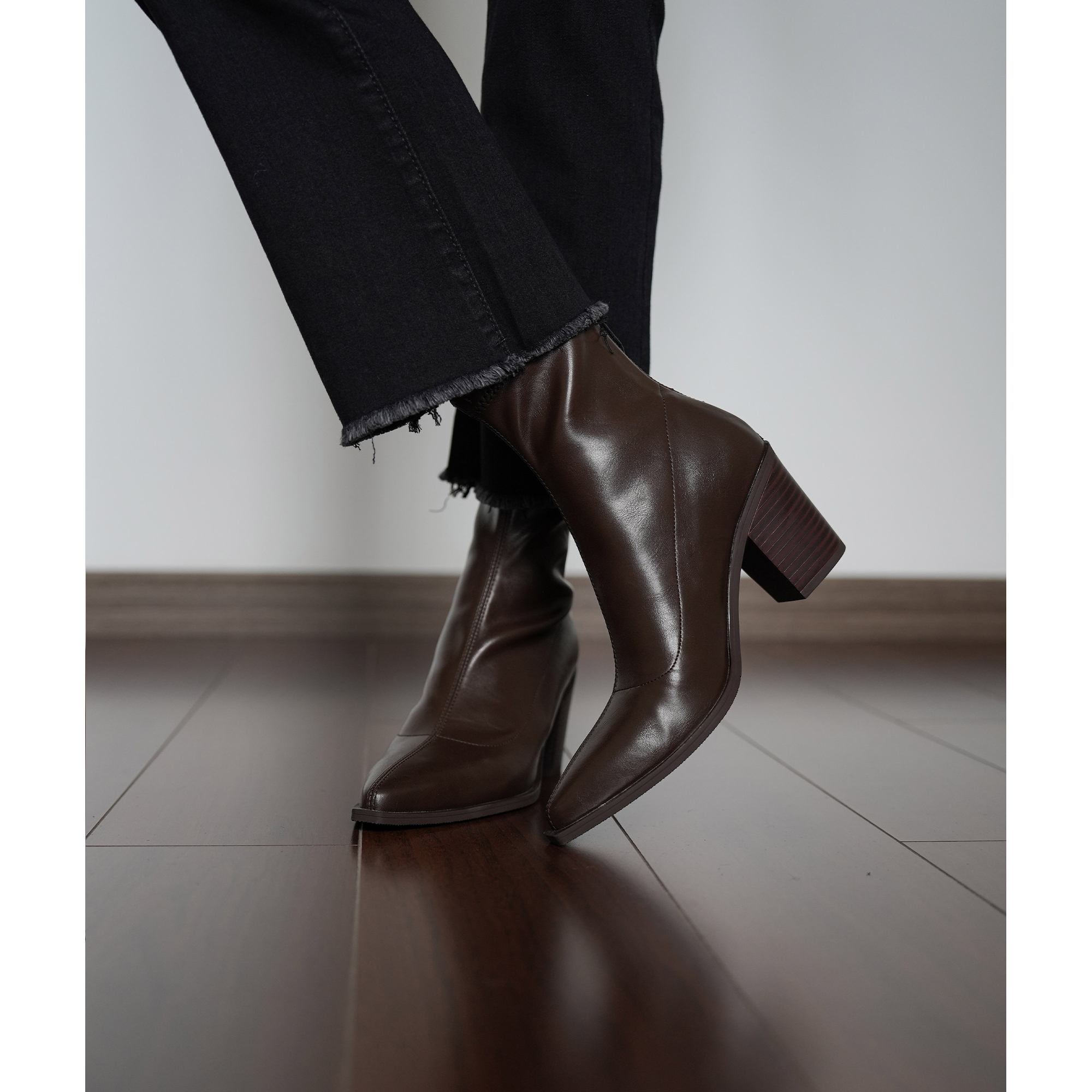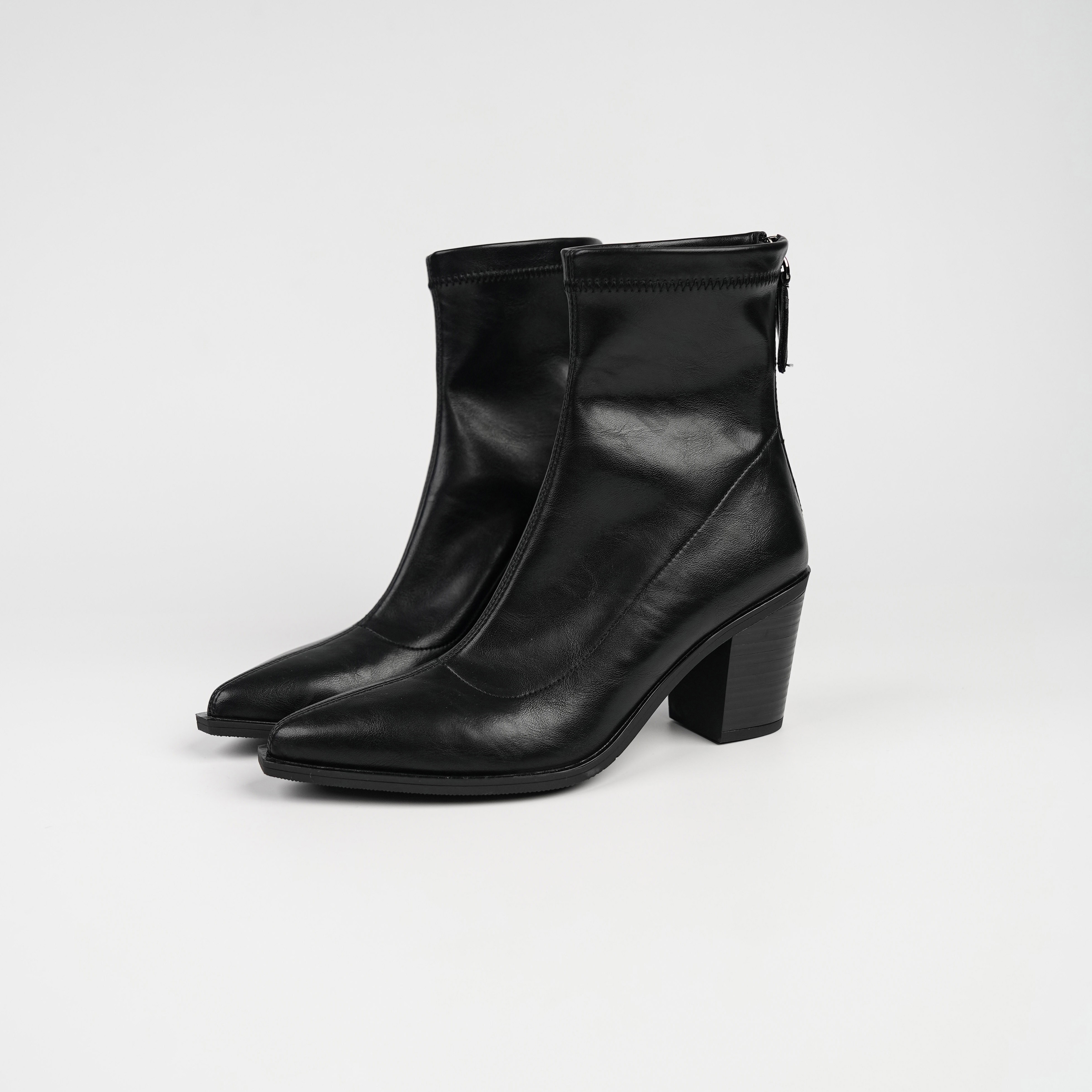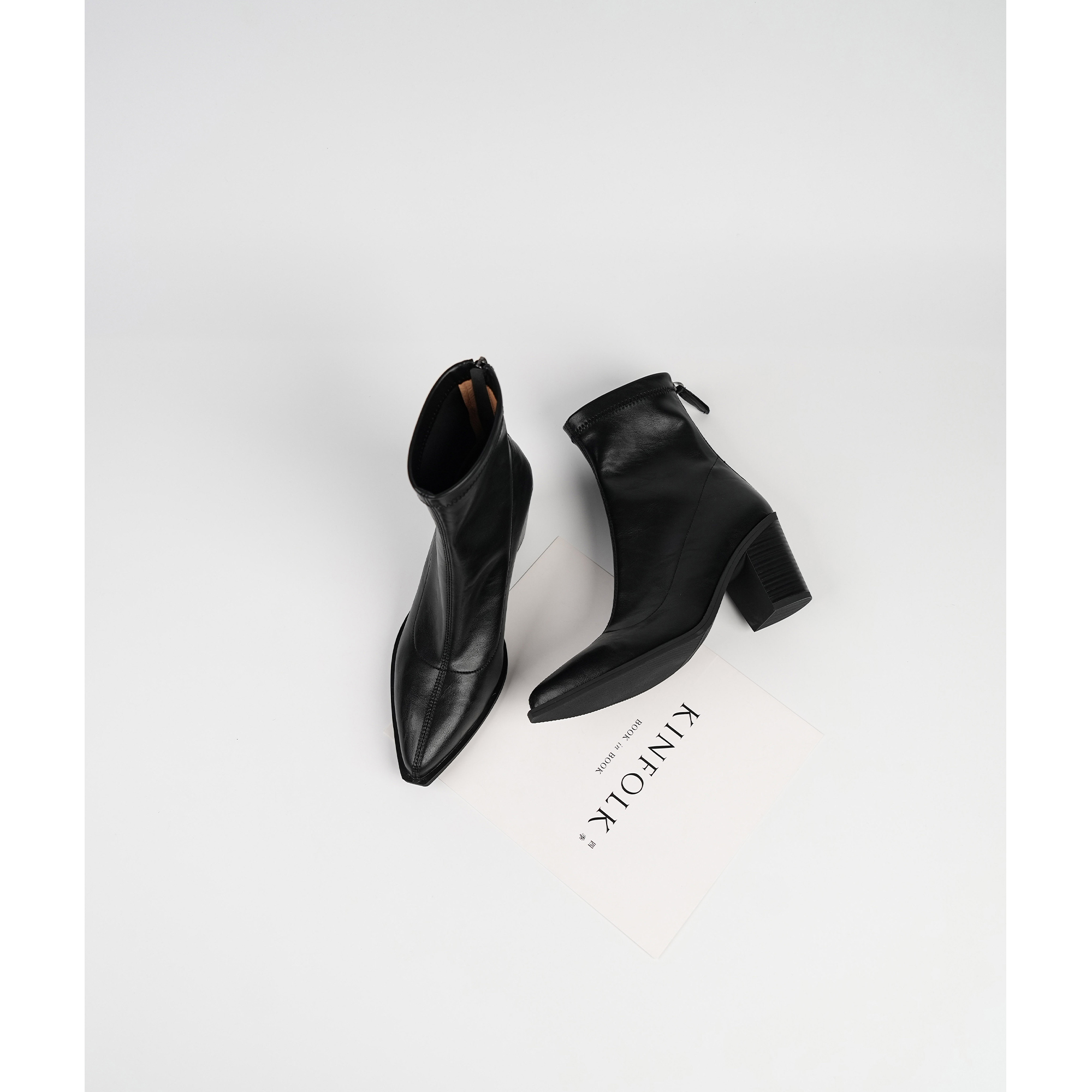 Fermina 复古尖头短靴女粗跟高跟西部靴新款通勤女靴子黑色瘦瘦靴
