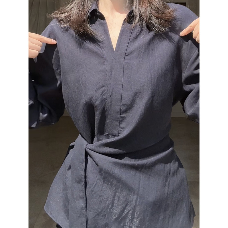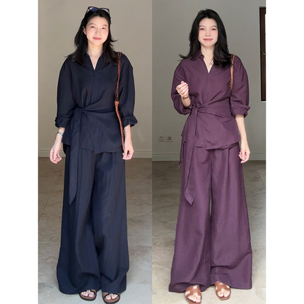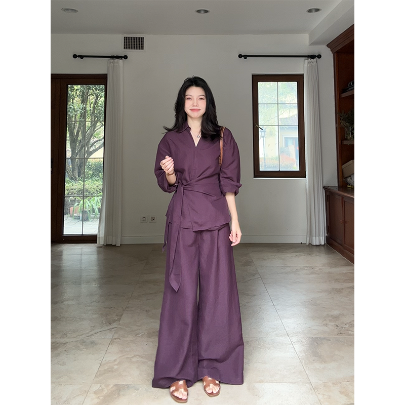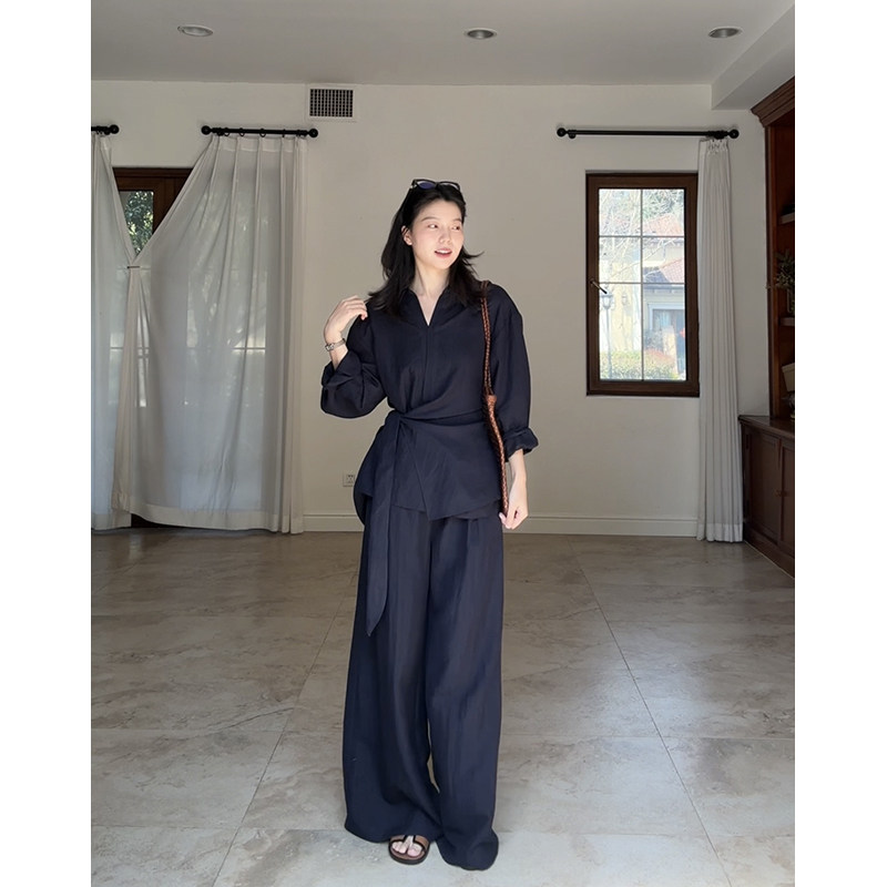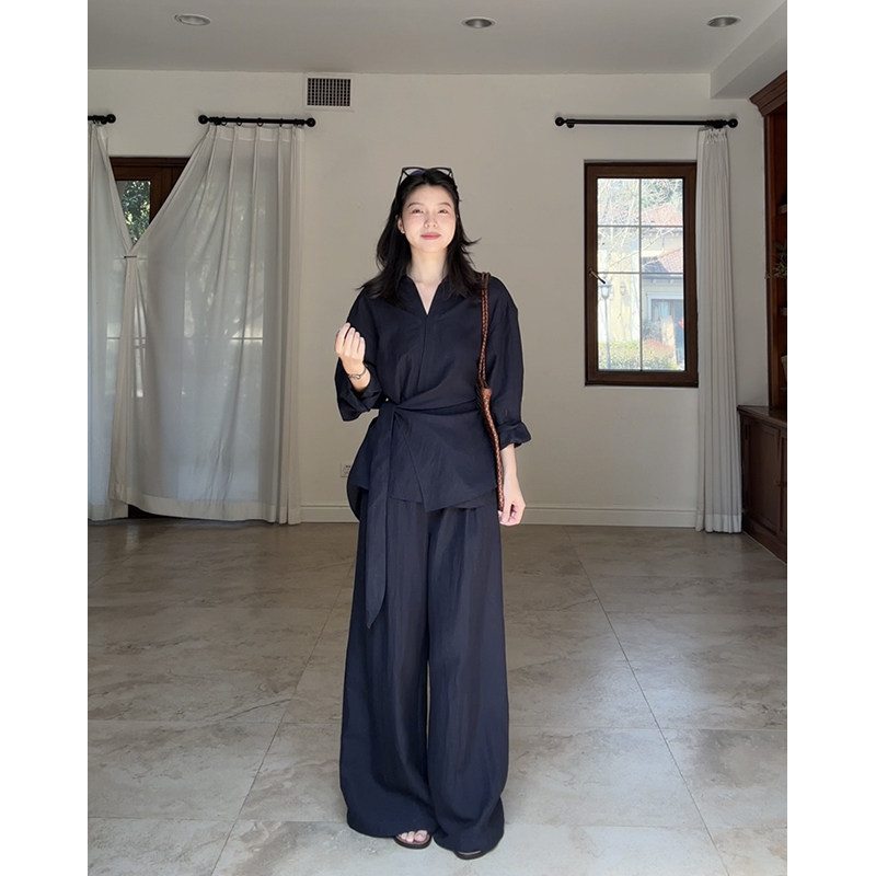 郭九九呢 亚麻天丝气质V领不规则系带衬衫春季小众上衣高腰阔腿裤