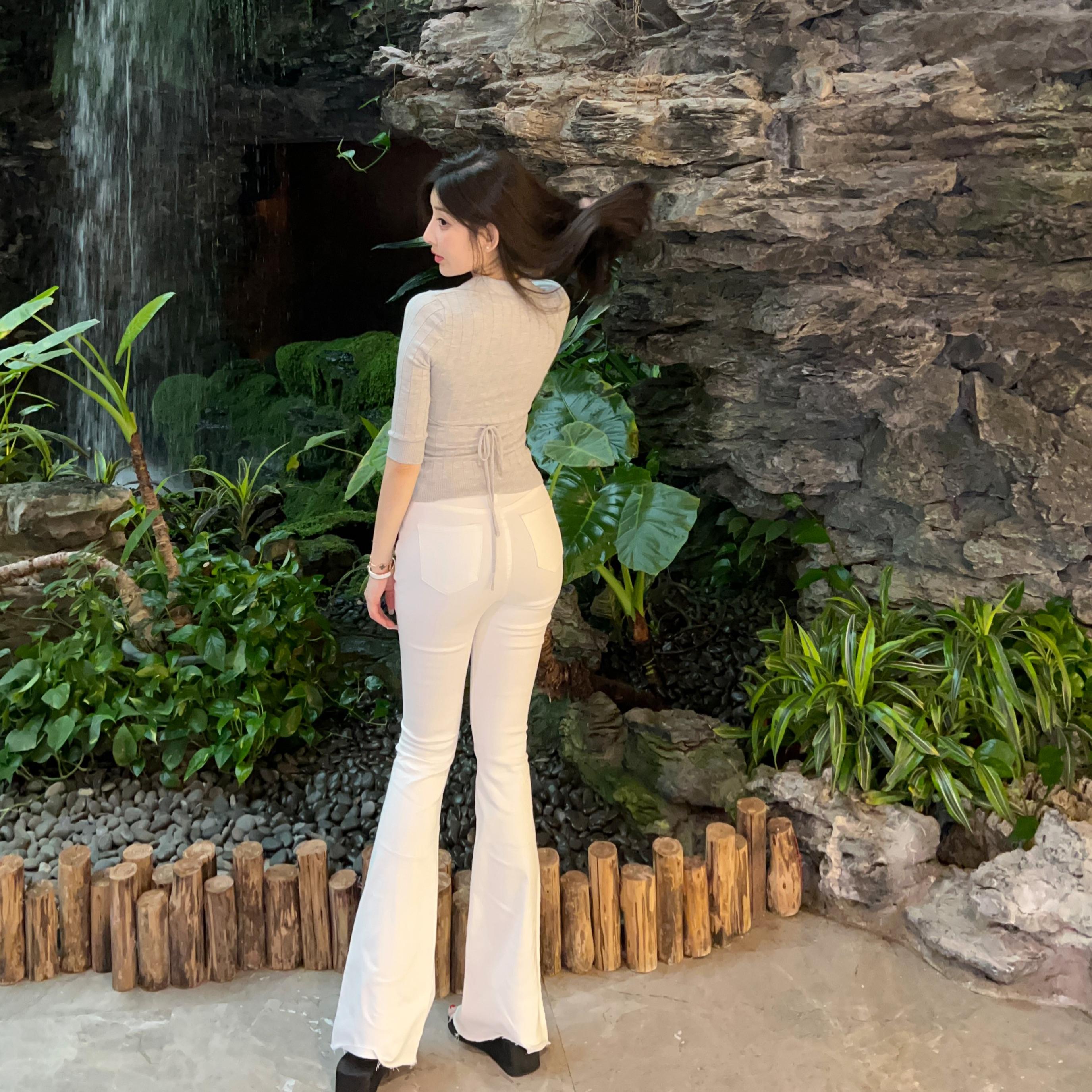 希野逸儿/韩系江南美人显腿长百搭白色拉链包臀高腰喇叭长裤女