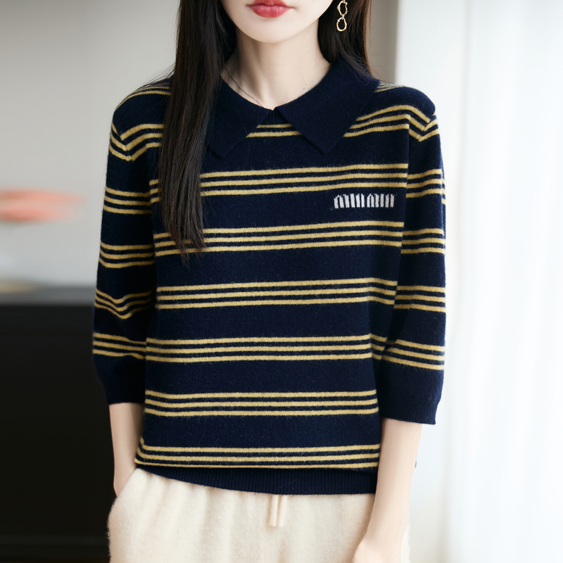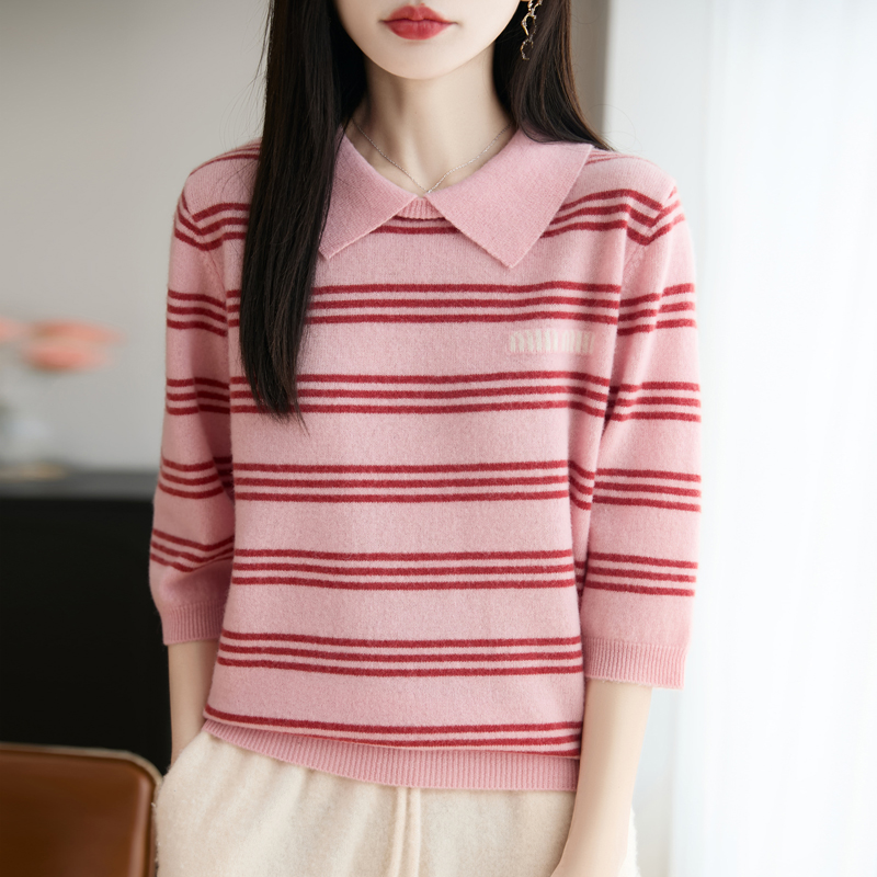 100%纯羊毛衫针织五分袖女翻领条纹拼色刺绣半袖宽松羊绒打底毛衣