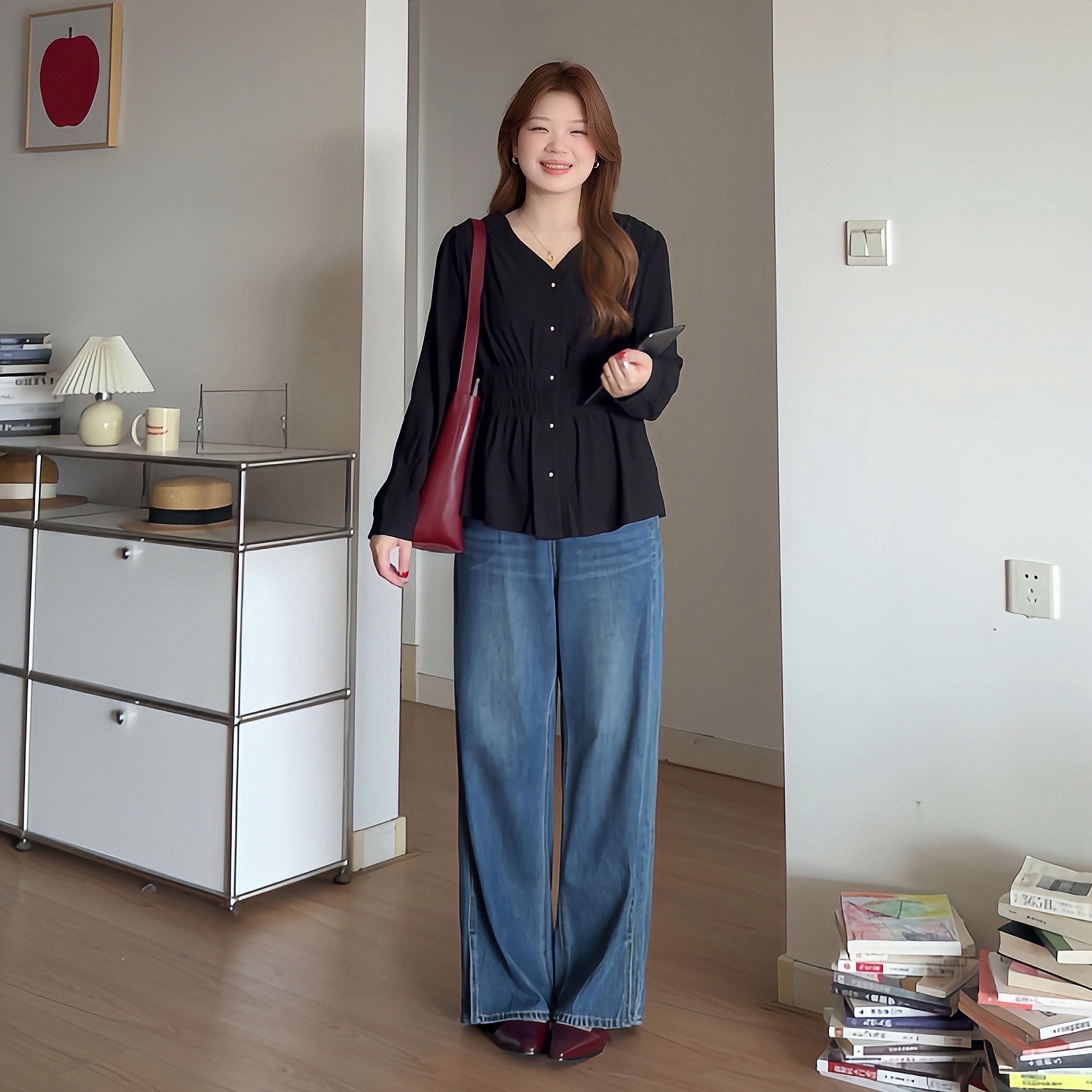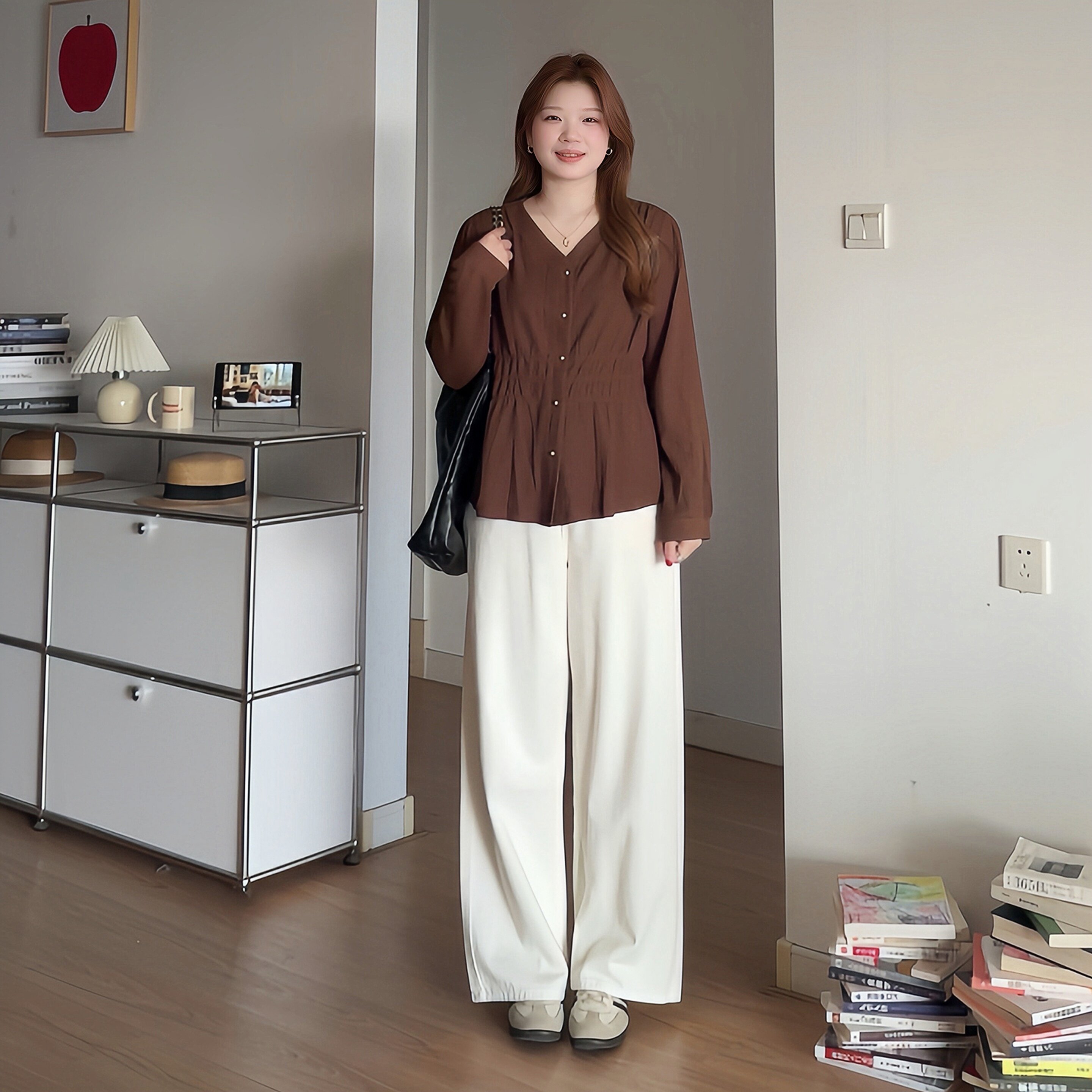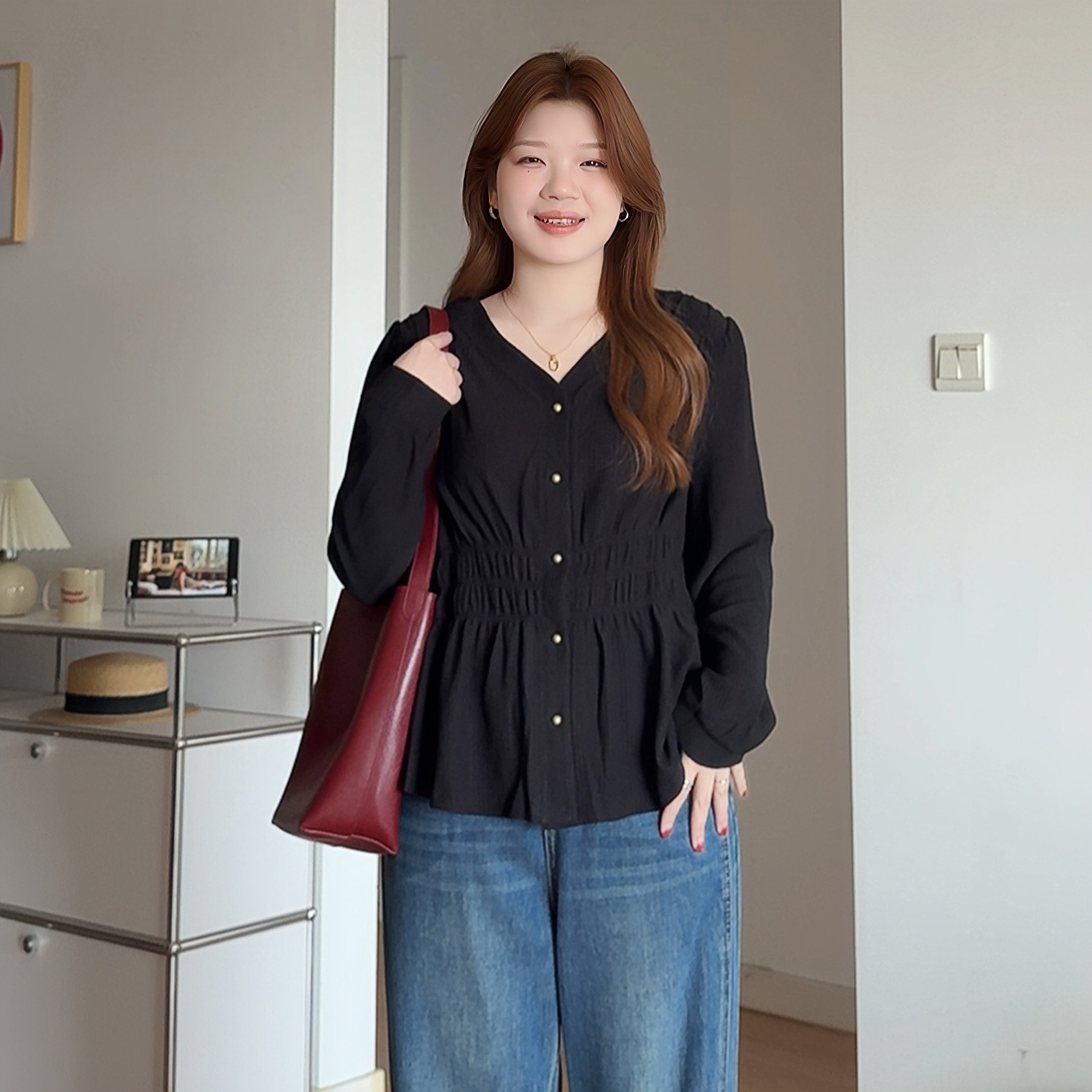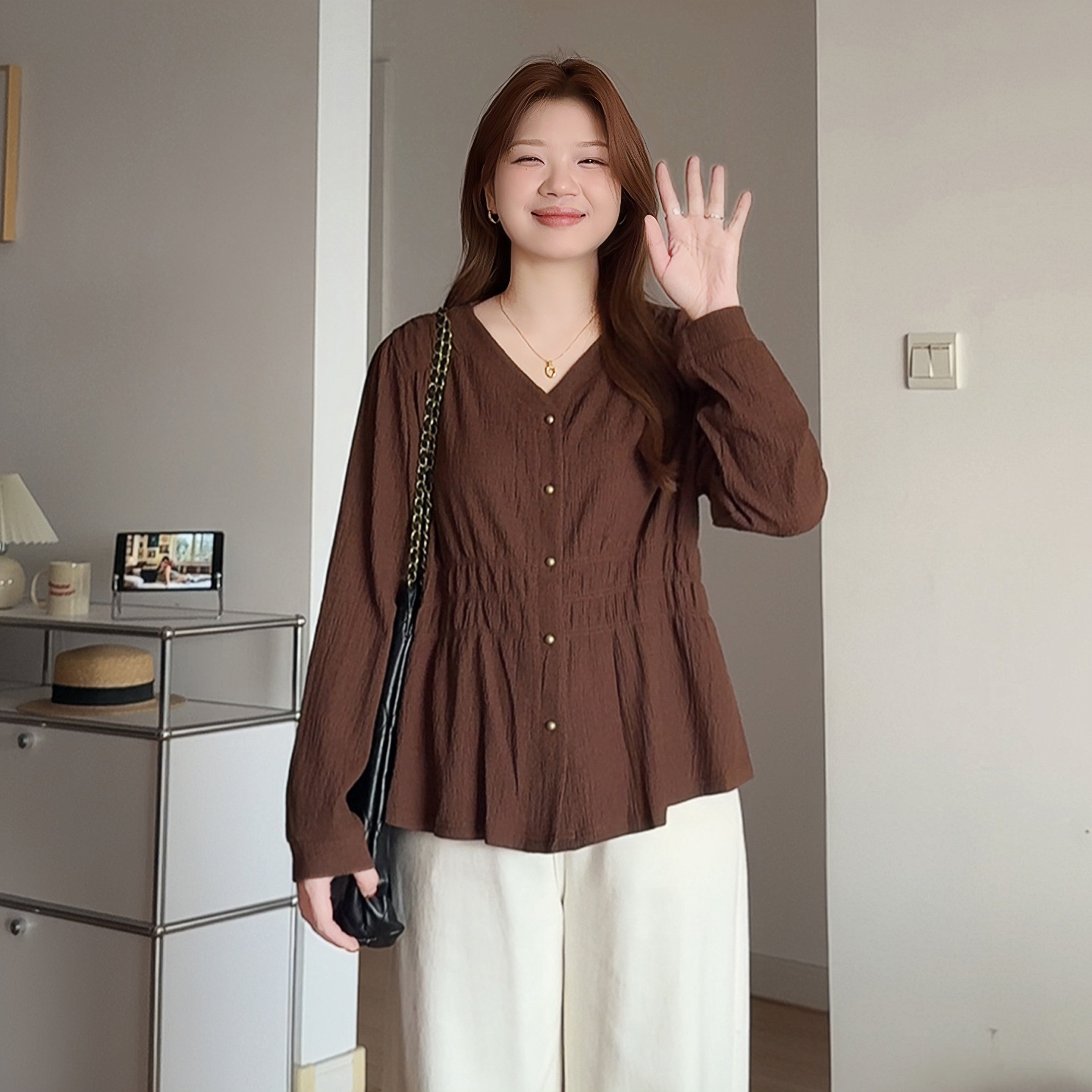 微胖mm韩系收腰巨显瘦长袖衬衫