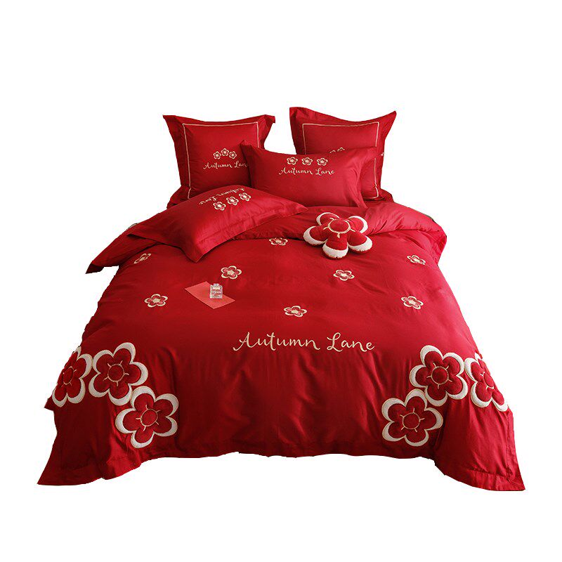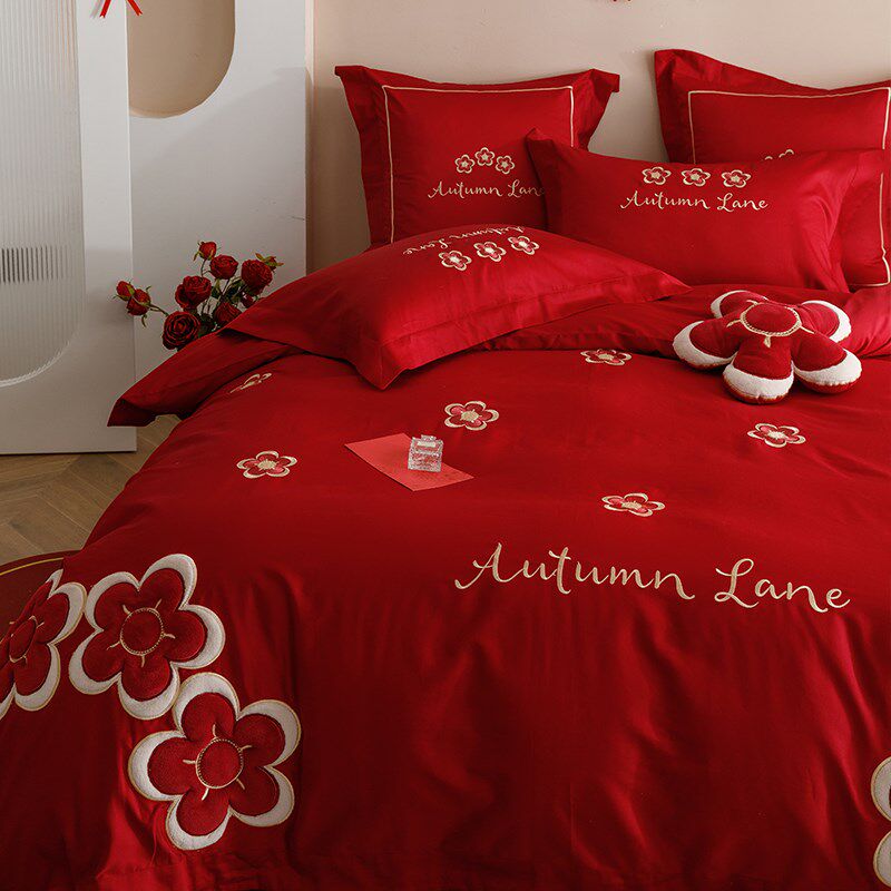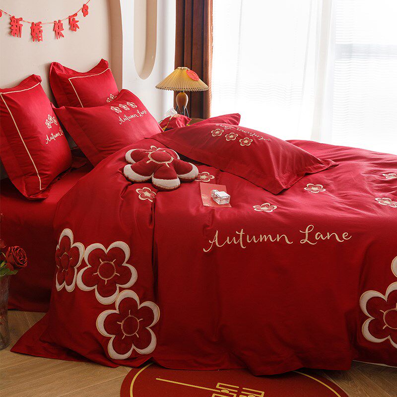 结婚四件套高端刺绣全棉纯棉大红色床单被套喜被婚庆Y婚床床上用