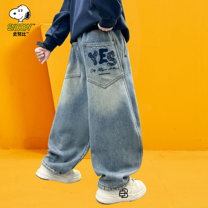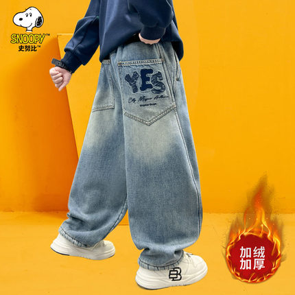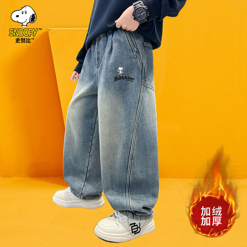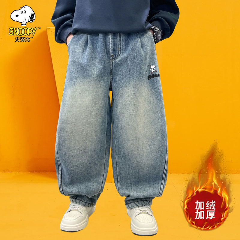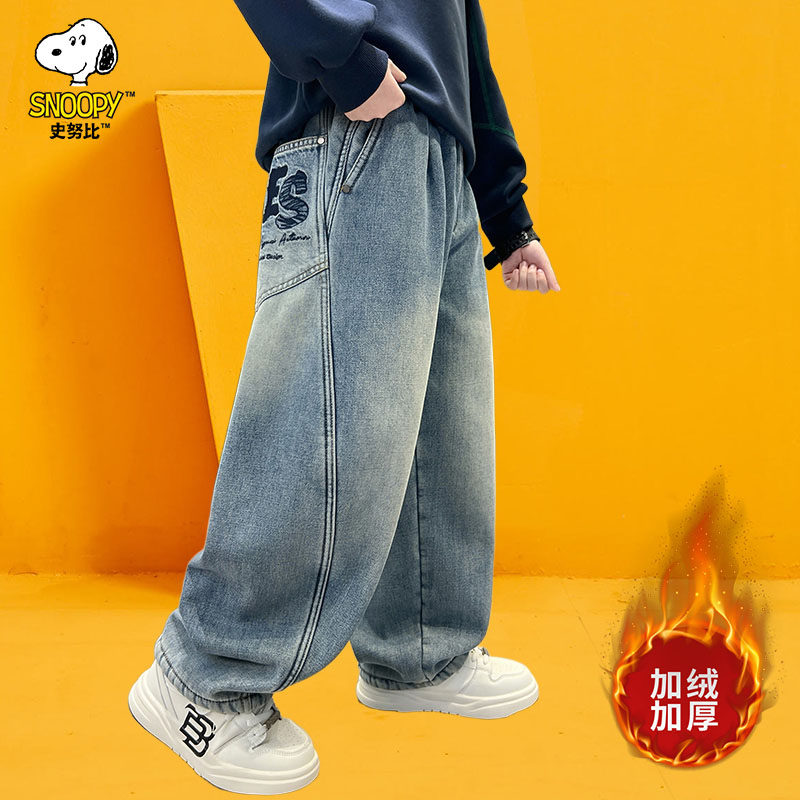 史努比童装男童加绒牛仔裤儿童秋冬裤子2025新款儿童冬装男孩长裤