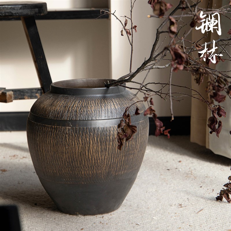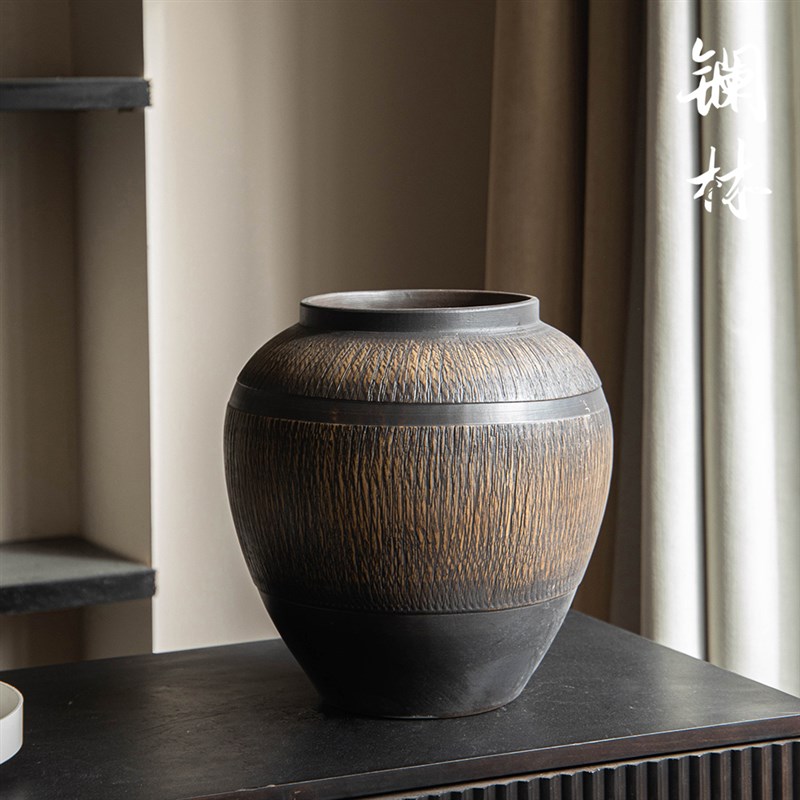 简约现代陶瓷花瓶插花装饰侘寂风客厅摆件黑色大口中式陶瓷插花瓶