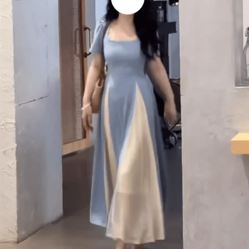 大码方领短袖e雪纺纯色法式收腰连D衣裙女微胖mm夏装新款中长裙子