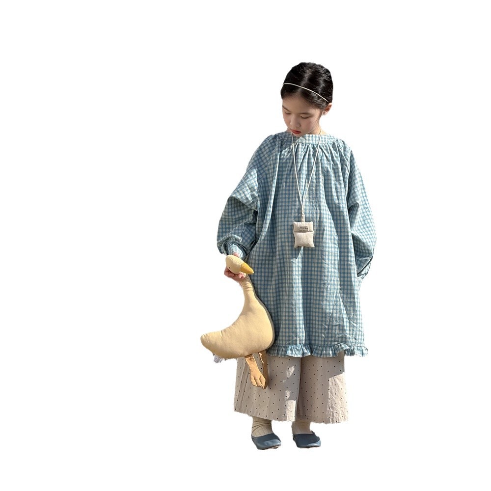 秋款女童宝宝衬衫中长款花边格子长裙儿童长袖休闲宽松裙衫纯棉布