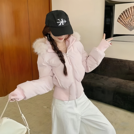 2025冬季新款粉色毛领羽绒棉服短款收腰显瘦百搭减龄保暖棉袄外套