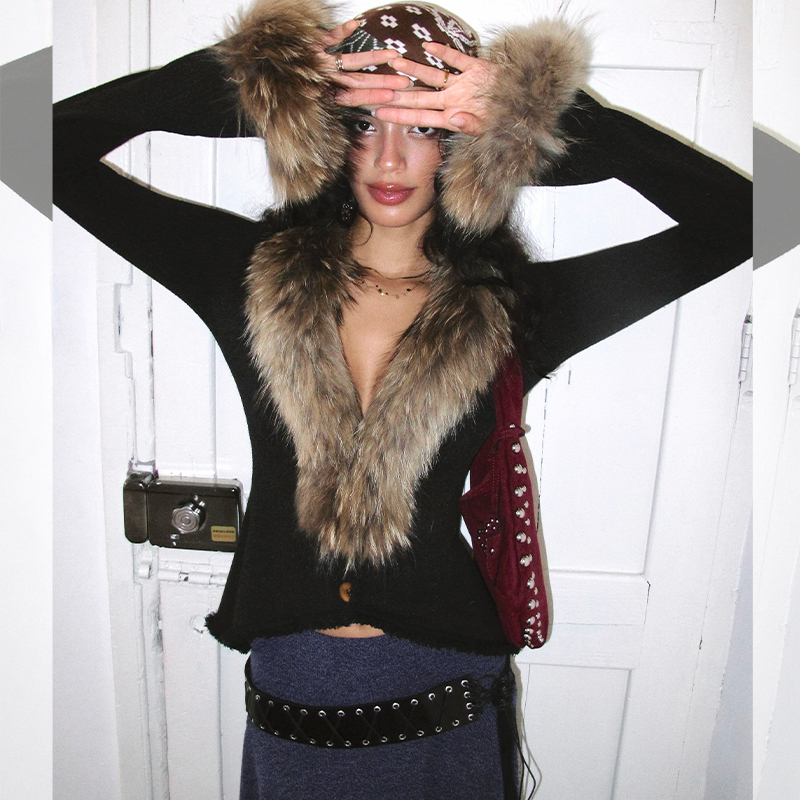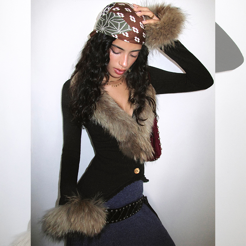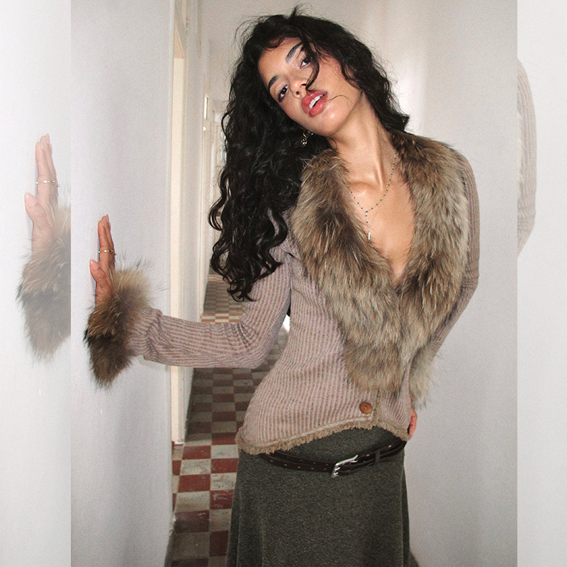 ITSNIKAR 10/20 20:00 貉子毛领毛针织开衫外套女复古显瘦短上衣