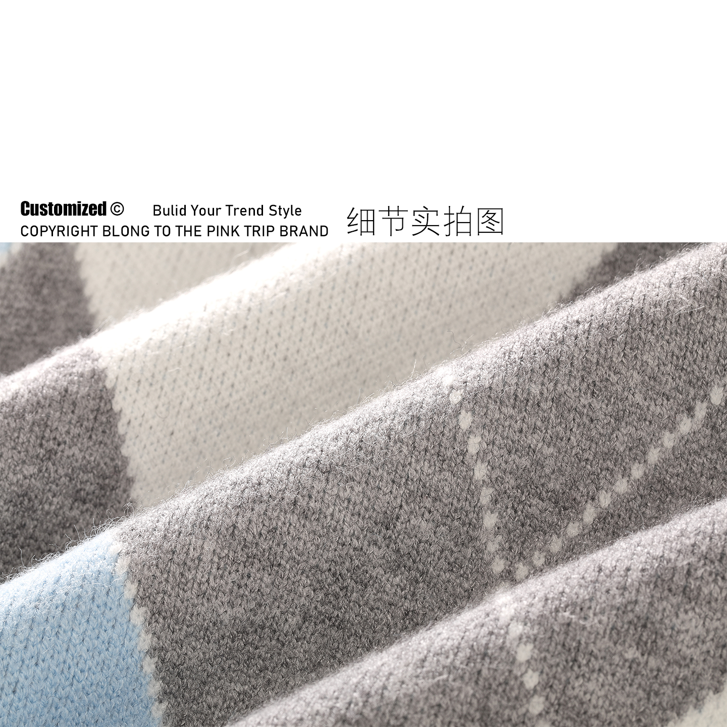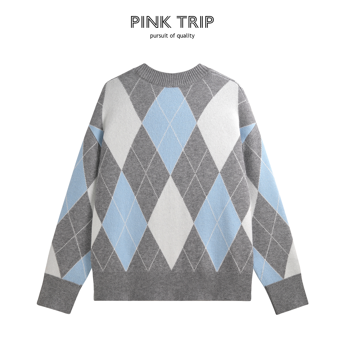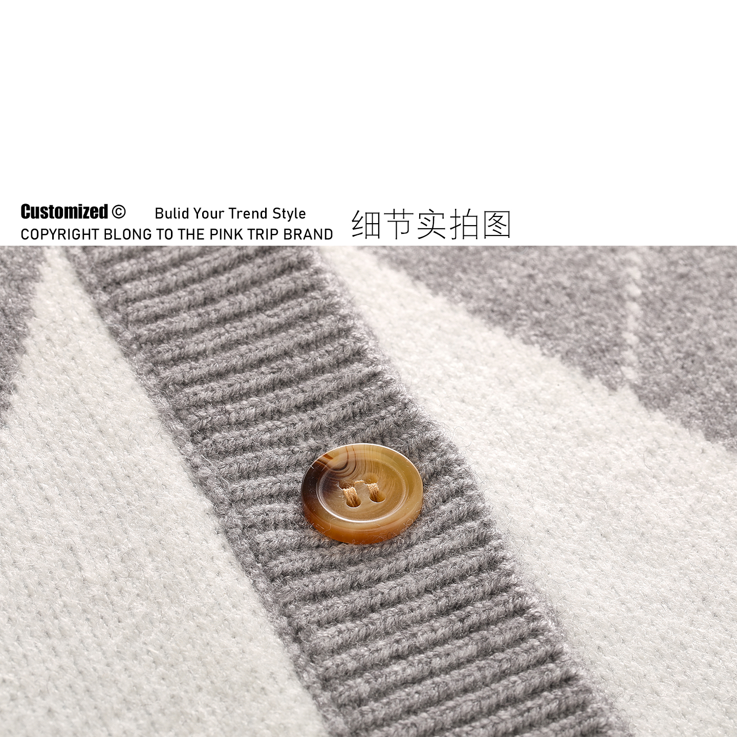 Pink Trip学院风撞色菱格针织开衫女秋冬新款宽松慵懒风毛衣外套