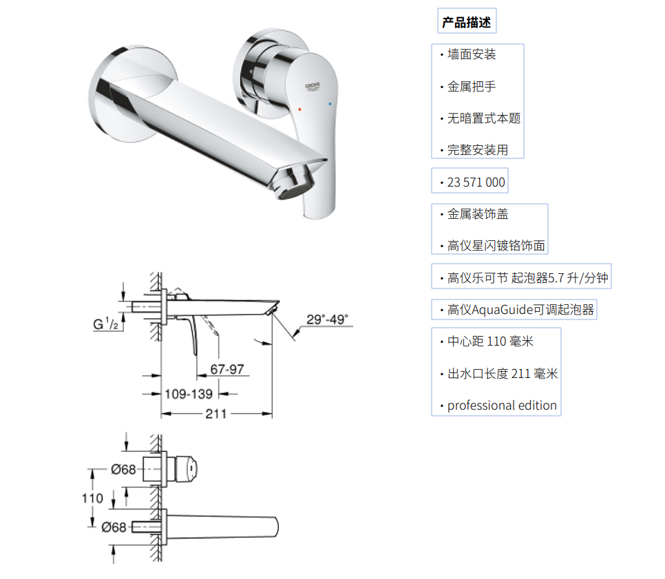 德国高仪29338003欧瑞斯玛29338墙出水面盆龙头含阀芯