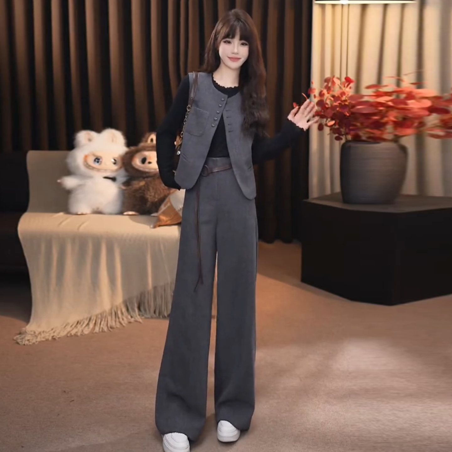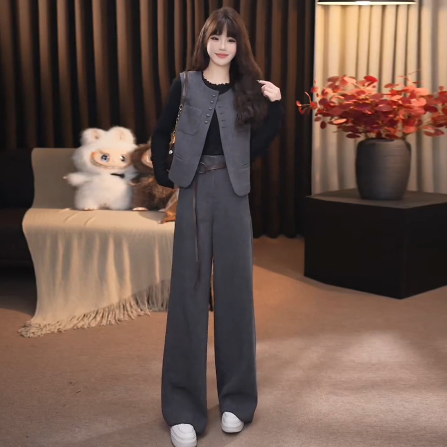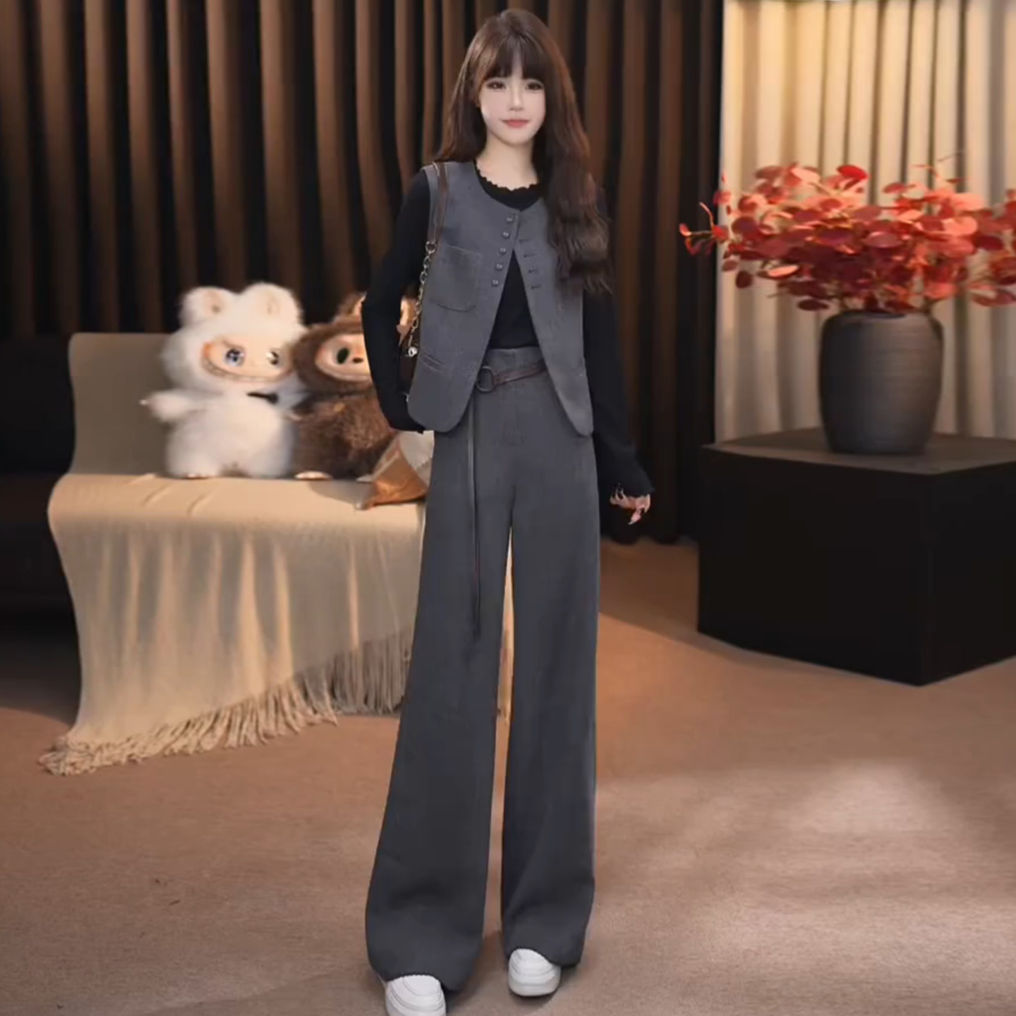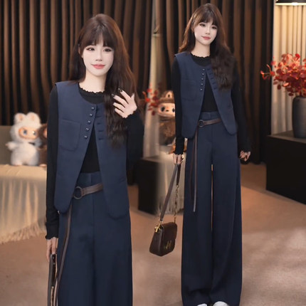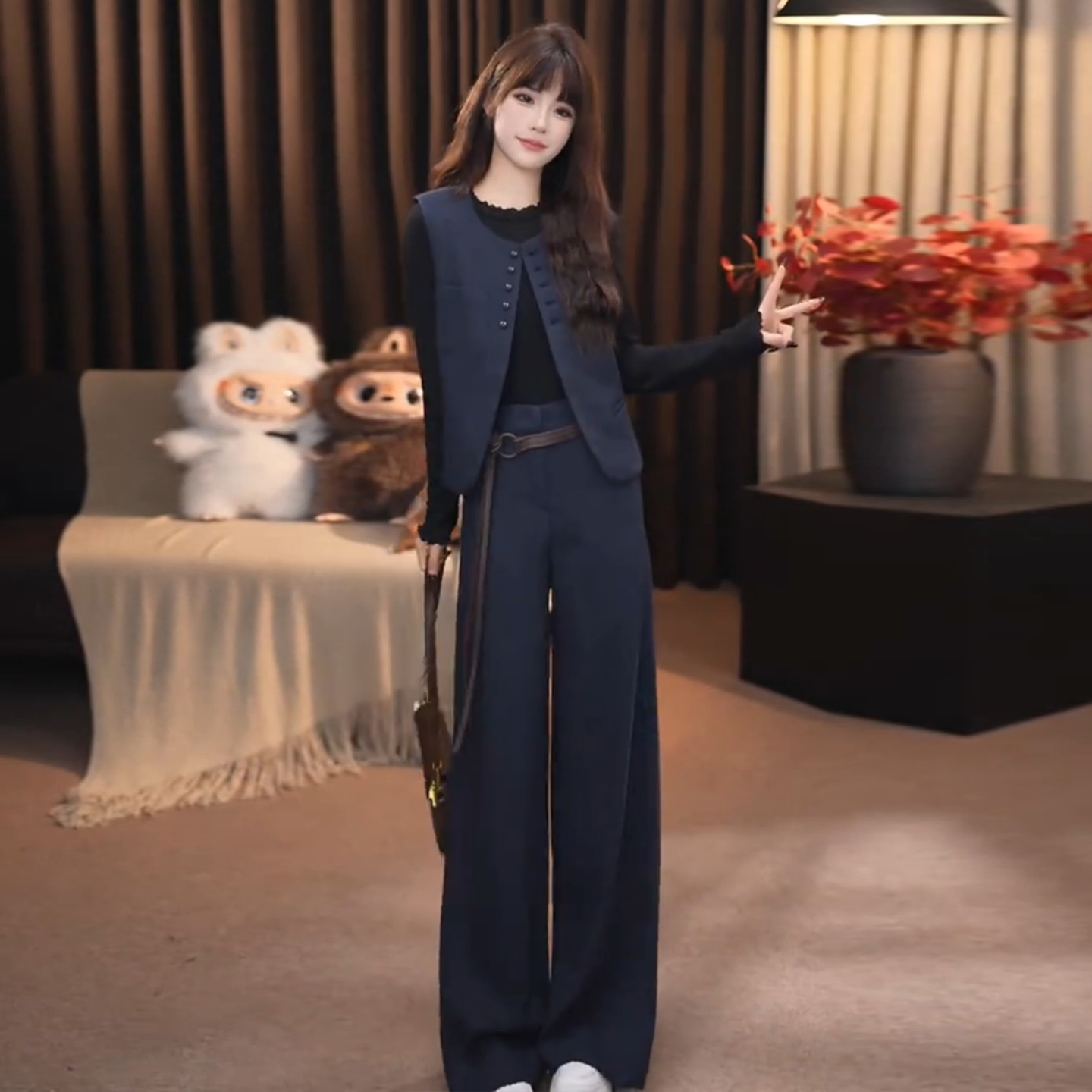 时尚套装女2025秋季新款洋气显瘦西装马甲长袖打底衫阔腿裤三件套