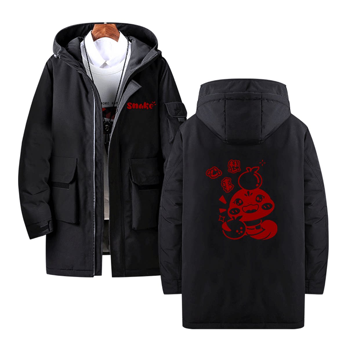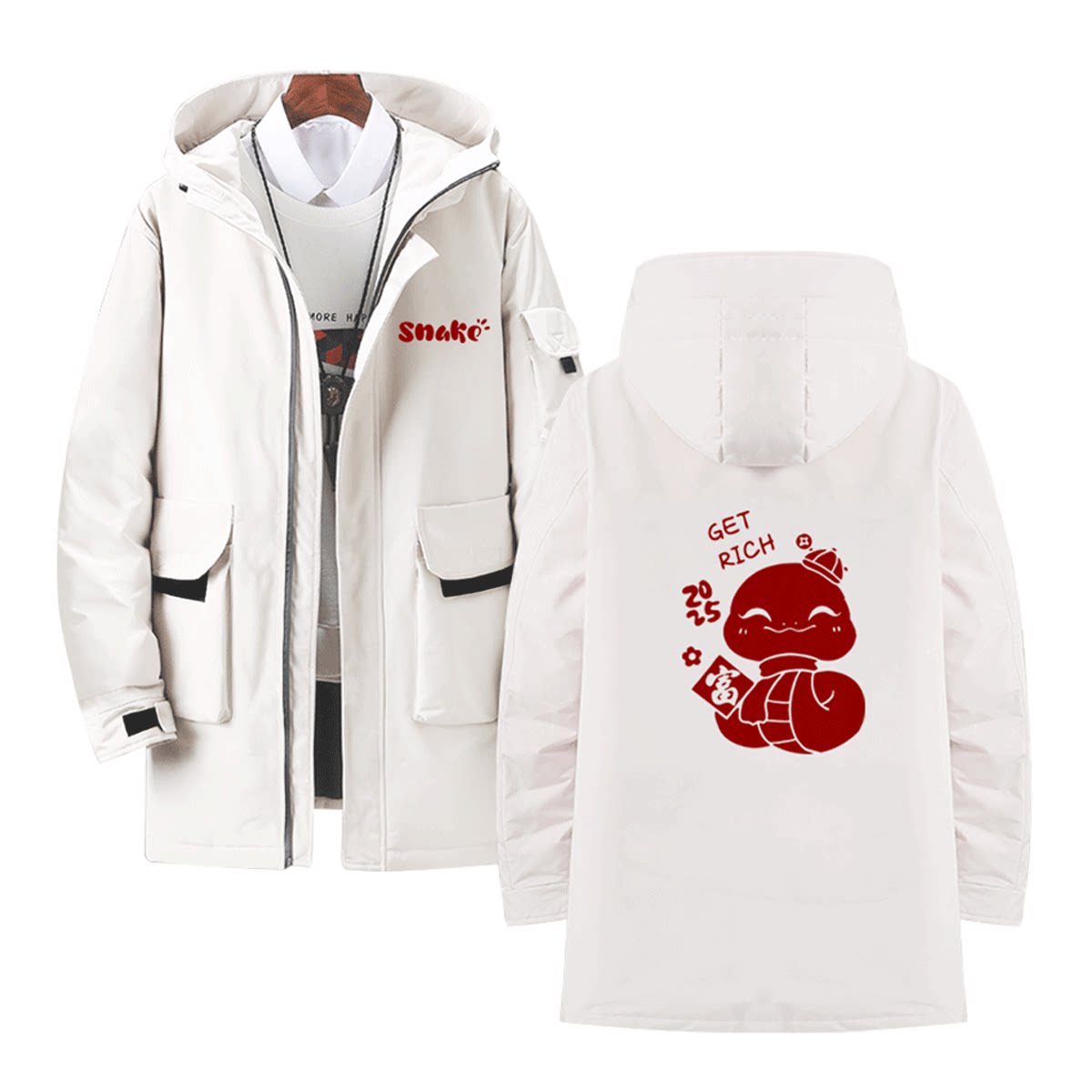 国潮蛇年酒红色男女2025新年本命年情侣连帽外套中长款定制羽绒服