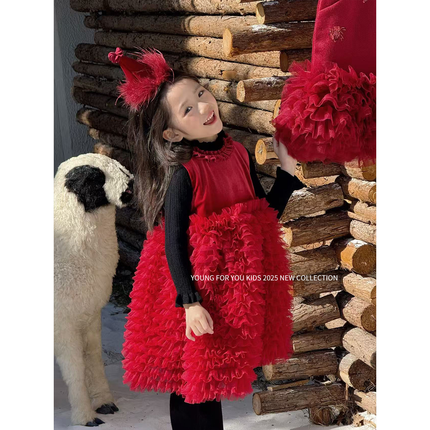 YFY秋冬女童生日裙蓬蓬裙连衣裙背心裙花朵领红色喜庆裙子拜年服