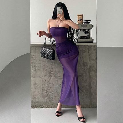 YoungGirlDay御姐纯欲风性感抹胸修身褶皱网纱包臀鱼尾连衣裙长裙