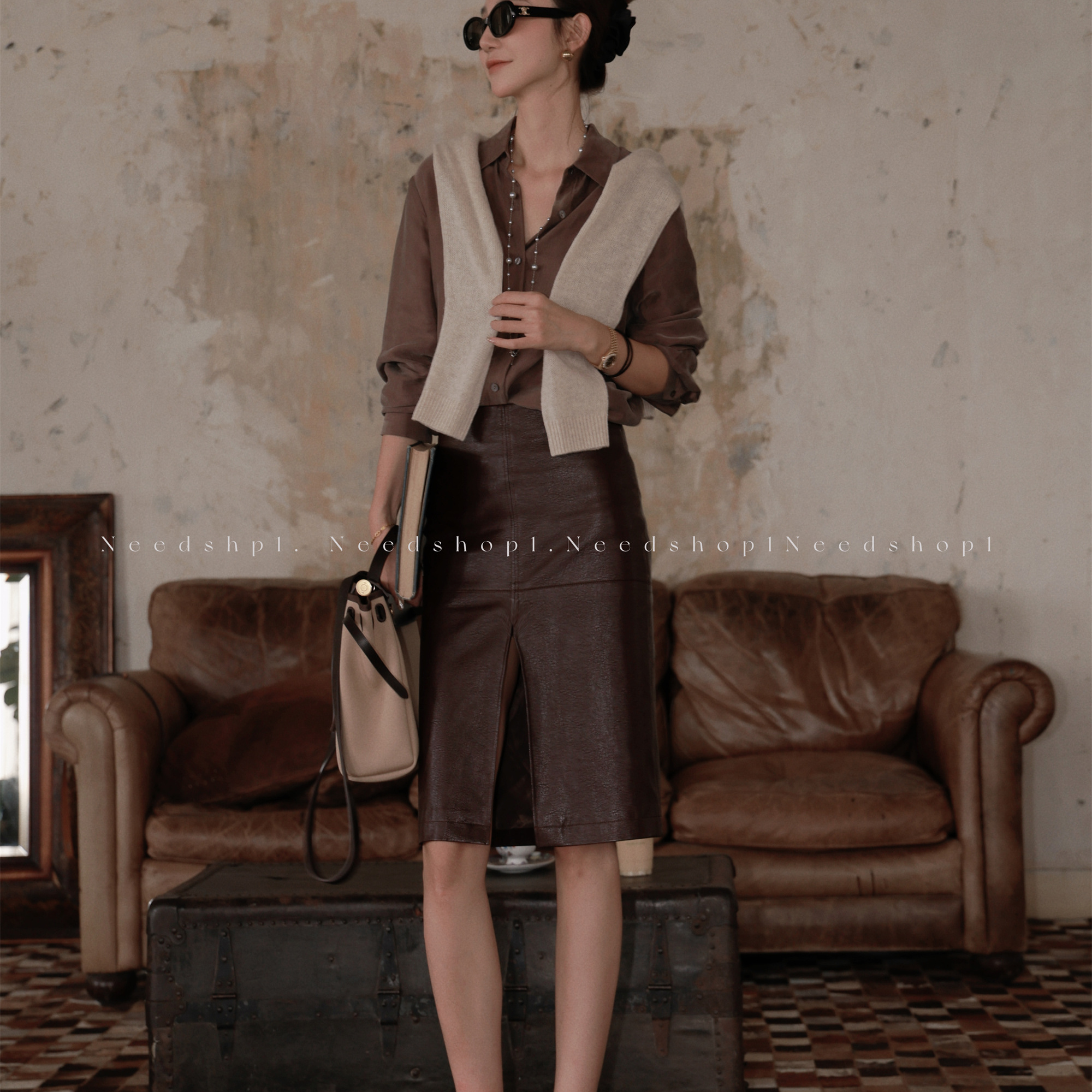 NeedShop1 秋季新款棕色特调色开叉时尚摩登百搭包臀皮裙