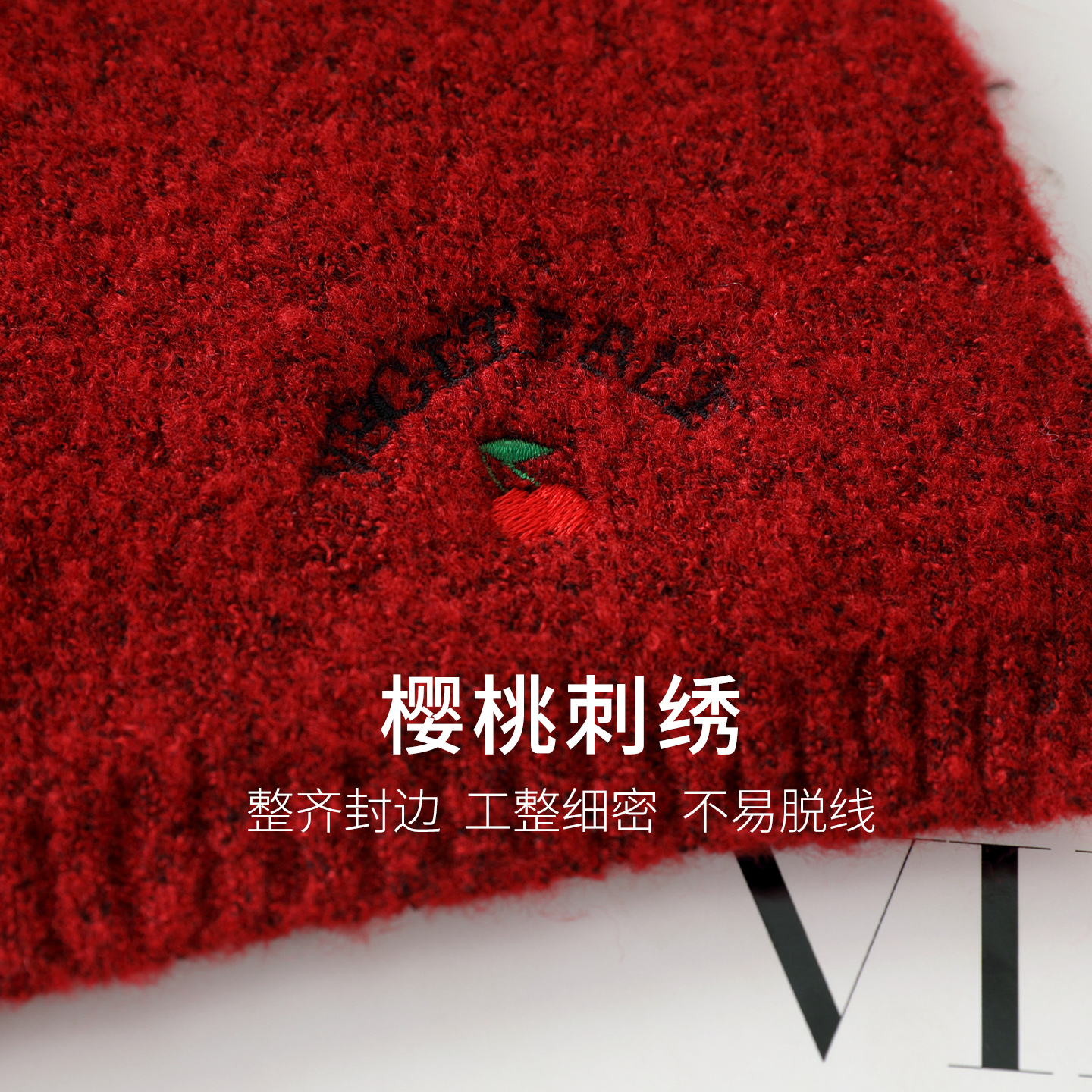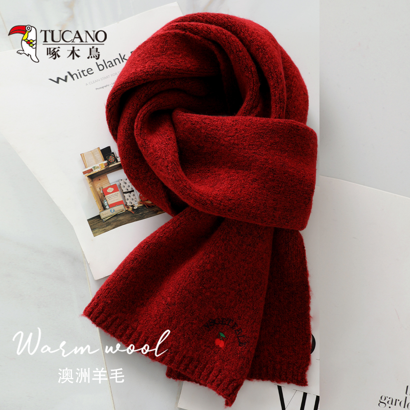 啄木鸟韩版刺绣樱桃针织红色围巾女秋冬季圣诞保暖学生护颈围脖