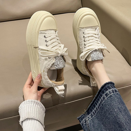 2025秋季新款小白鞋女厚底春季松糕白色流苏休闲女款小众帆布板鞋