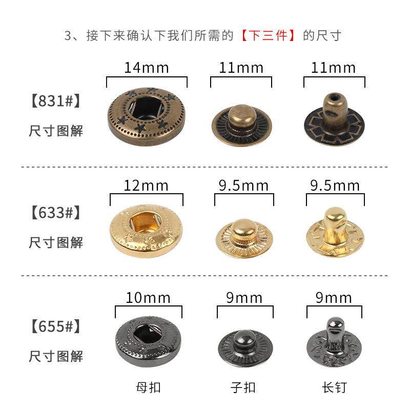 现货供应831/633/655金属铜按扣扣子大衣暗扣纽扣四合扣厂家
