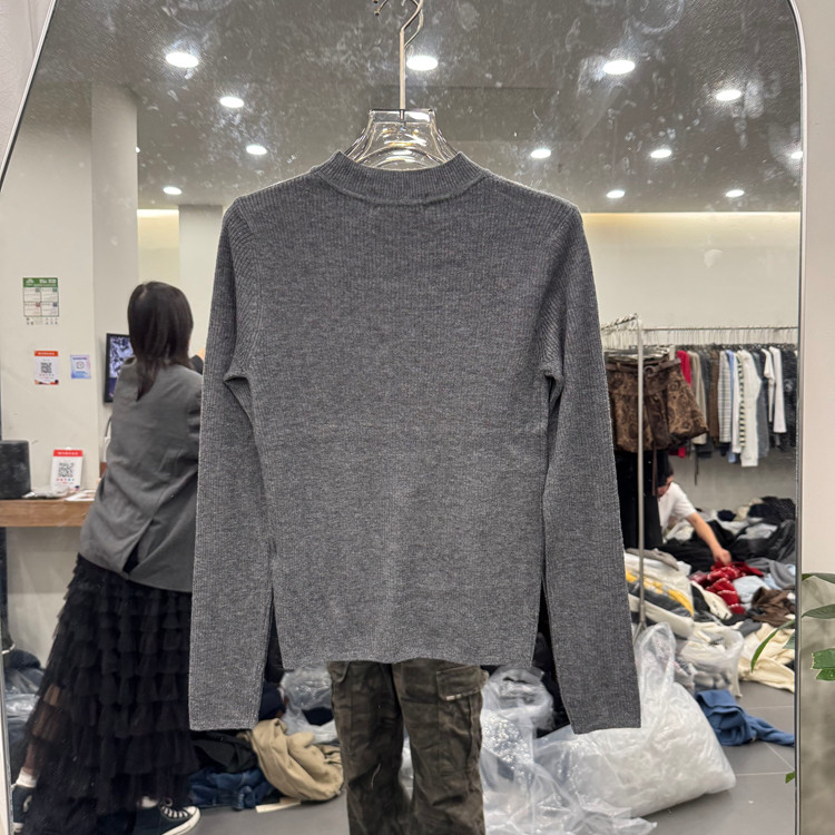 欧洲站圆领长袖纯色羊毛针织衫女