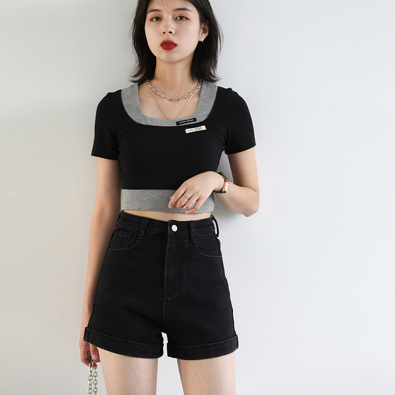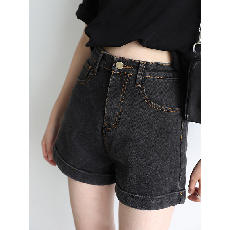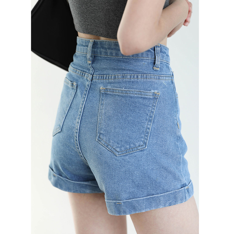 CV大码女装 入店bi败百搭复古高腰翻边纯色A字牛仔短裤女chic夏季