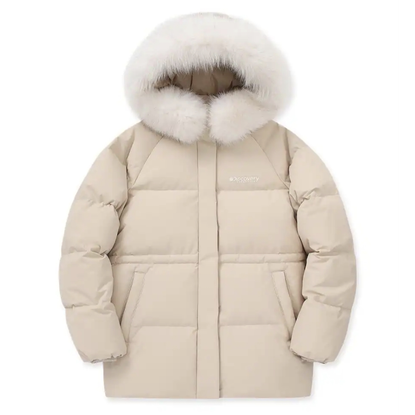 把价格打下来!正品韩国Discovery女80鹅绒连帽中长束腰厚羽绒服