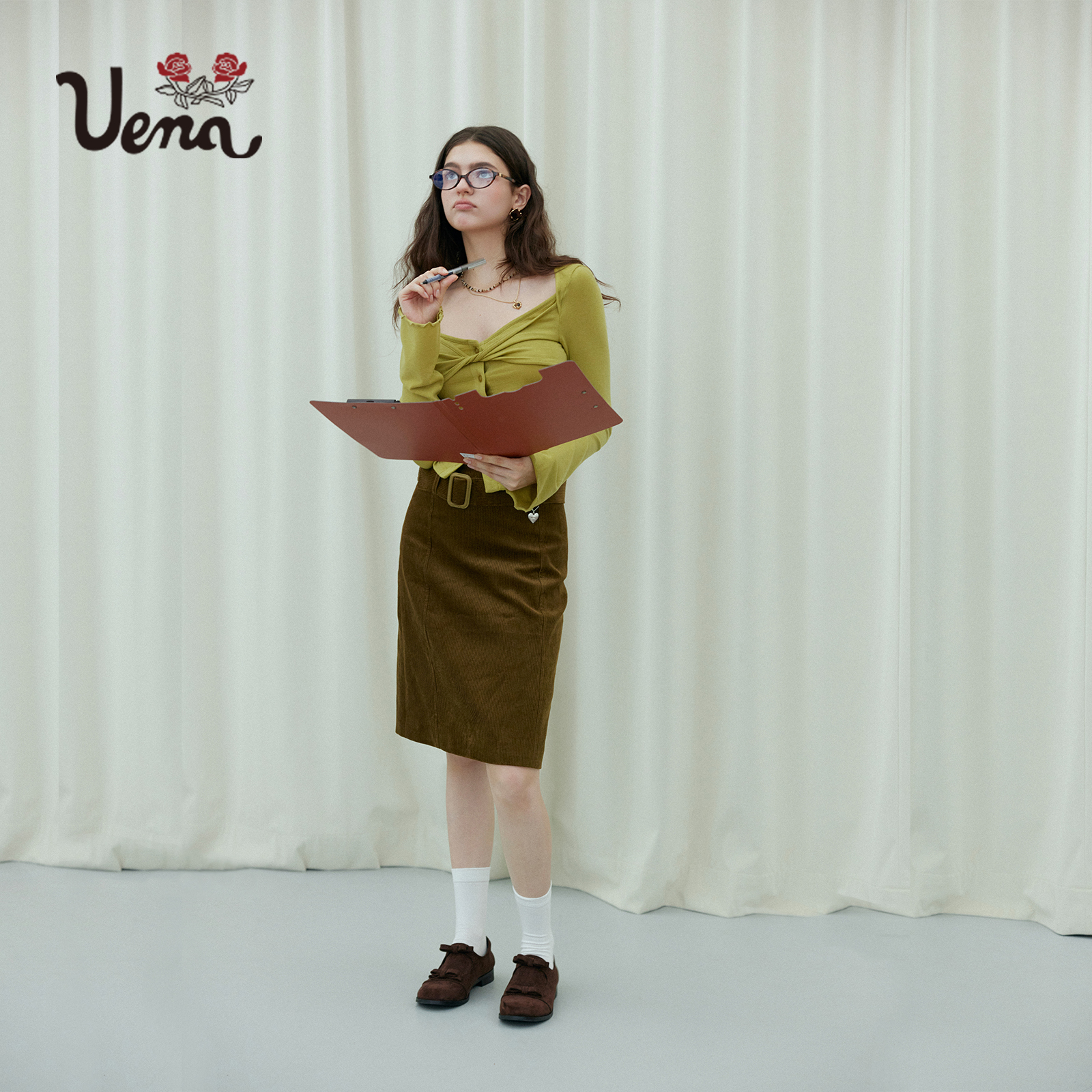 【旋转心动】Uena美式复古灯芯绒中长款A字半身裙附爱心挂件腰带