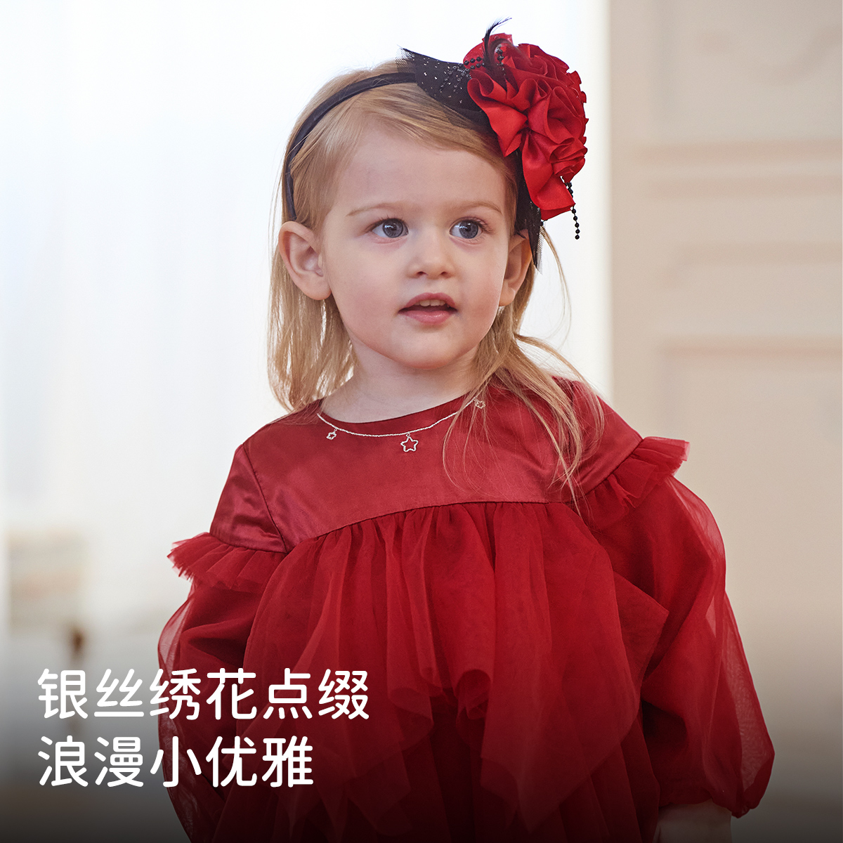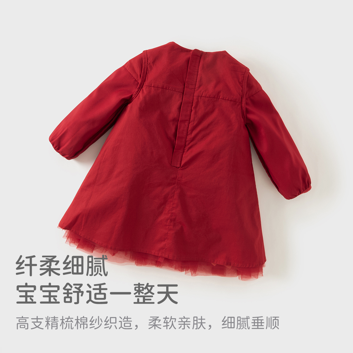 戴维贝拉2025新款秋装女童红色连衣裙儿童公主裙小童宝宝网纱裙子