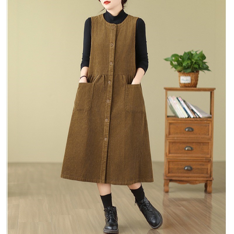 灯芯绒秋季无袖背心裙女士加厚中长款高端马甲连衣裙2024秋冬新款