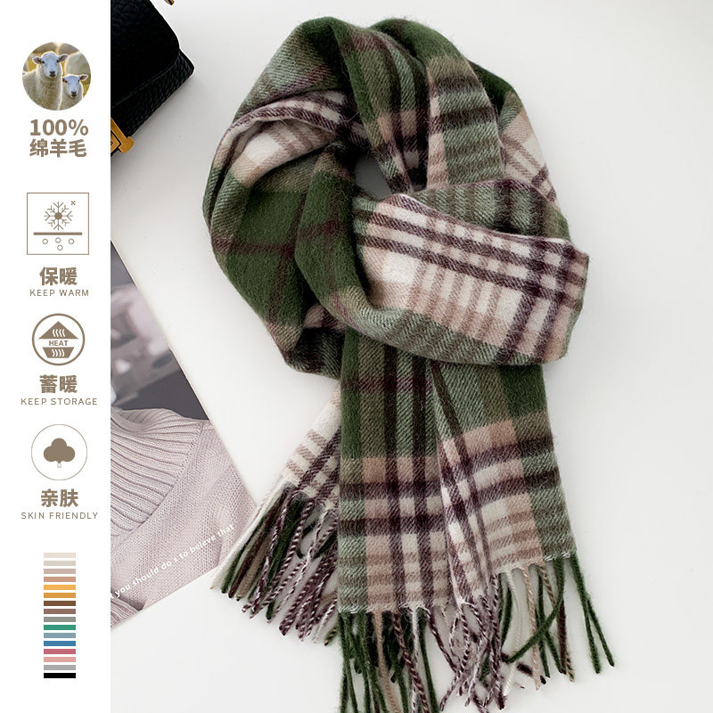 100%澳洲wool新款纯羊毛格子围巾女冬季英伦经典情侣学生保暖围脖