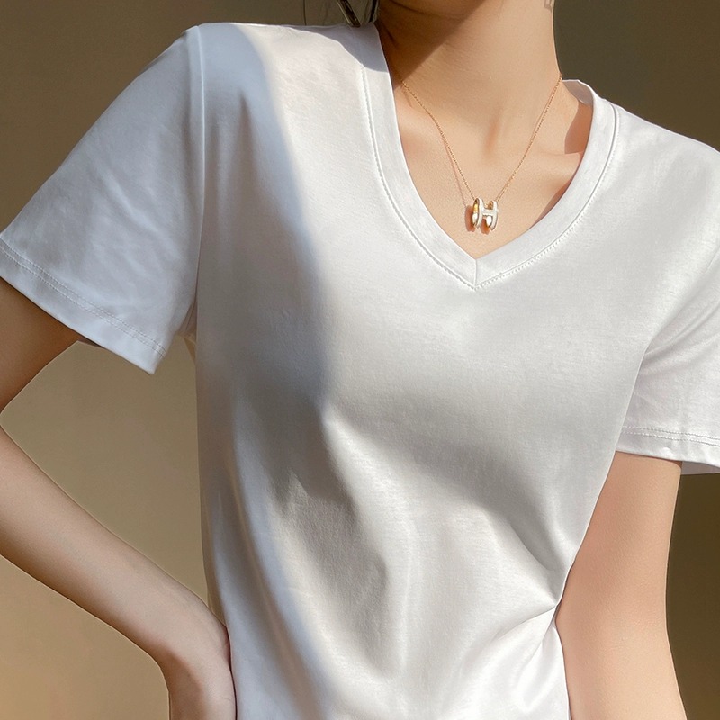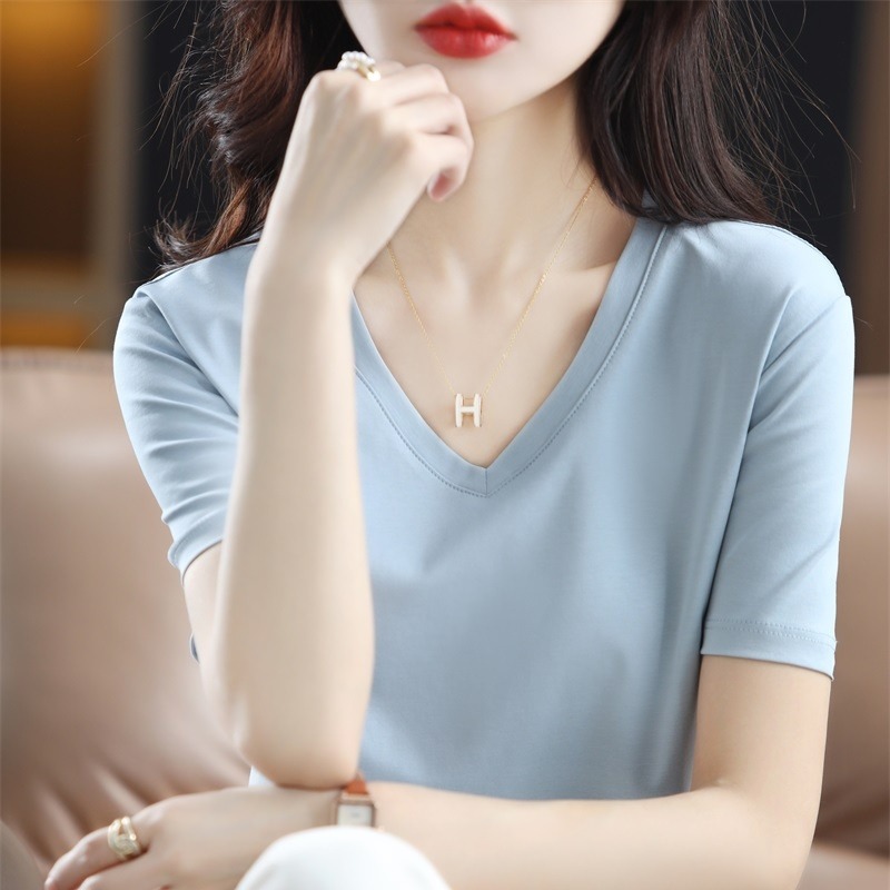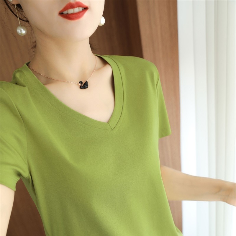 凉感丝光纯棉V领短袖T恤女宽松显瘦白色正肩体恤新疆棉半袖上衣薄
