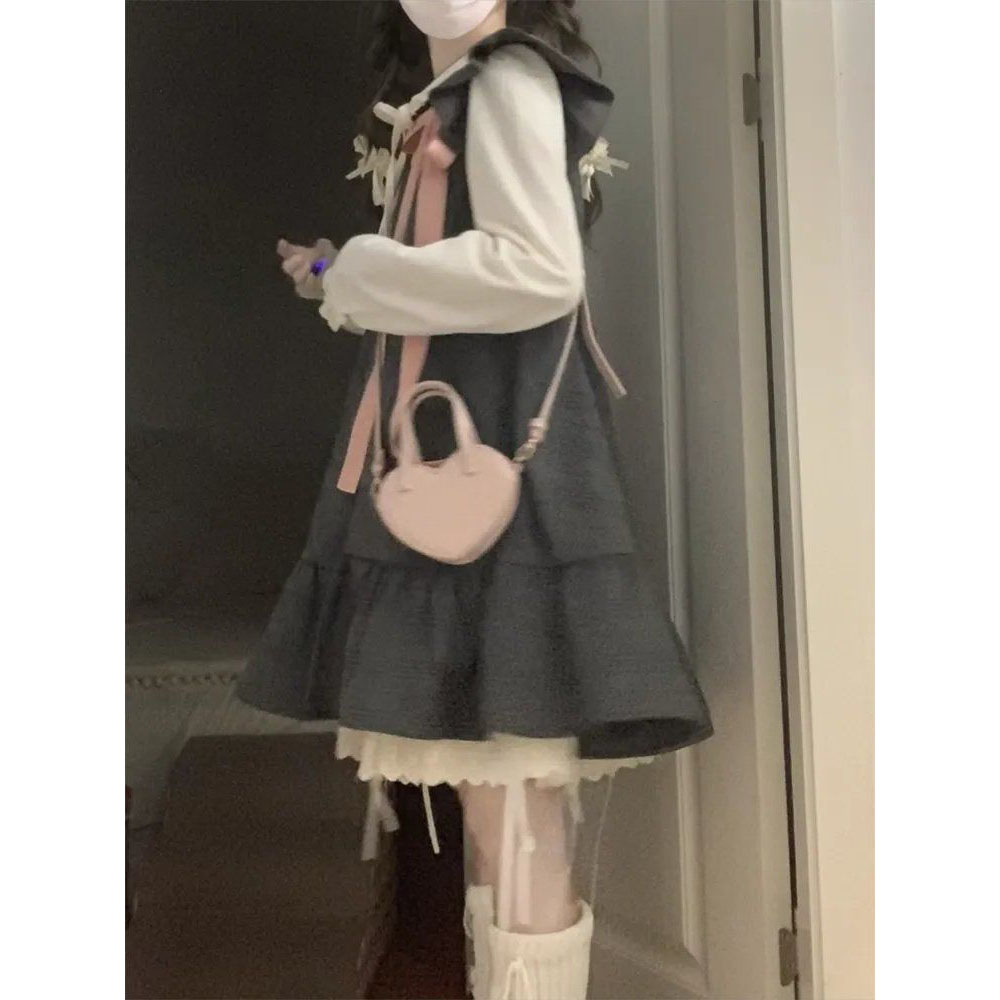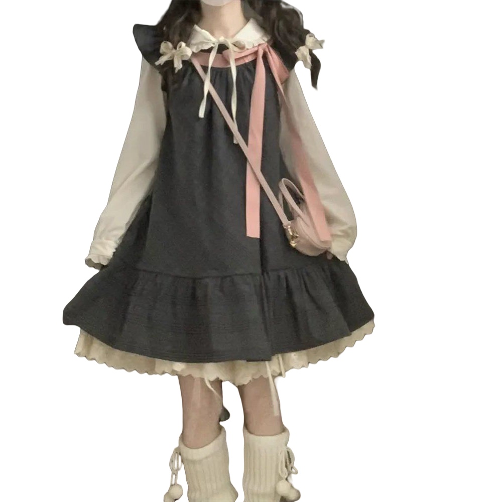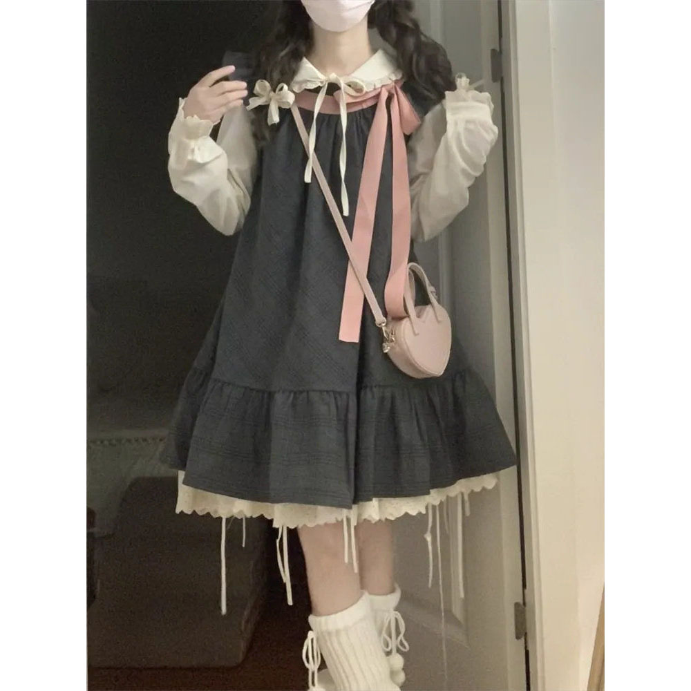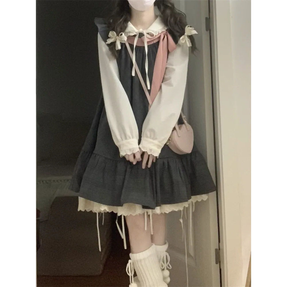 日系可爱小个子穿搭飞飞袖蝴蝶结连衣裙女搭配娃娃领衬衫两件套装