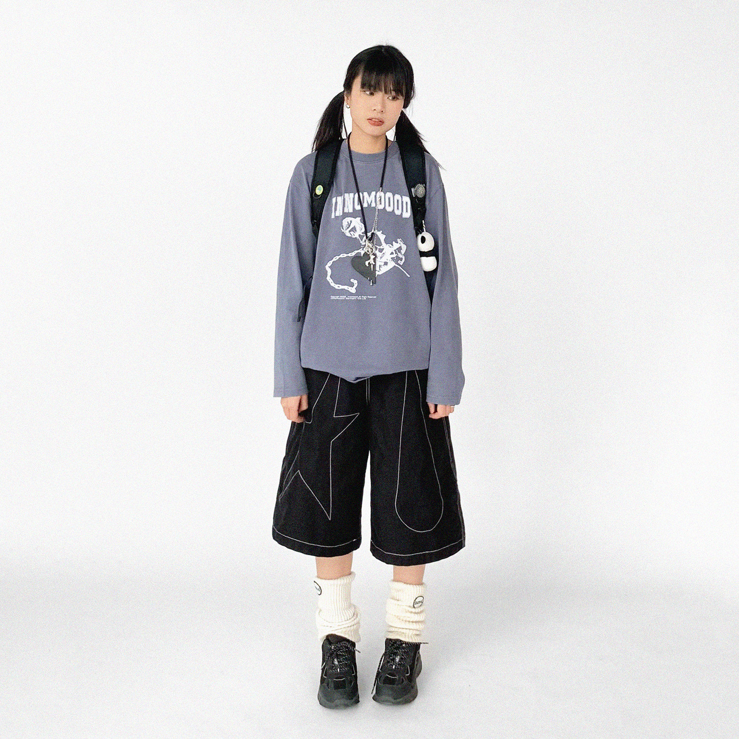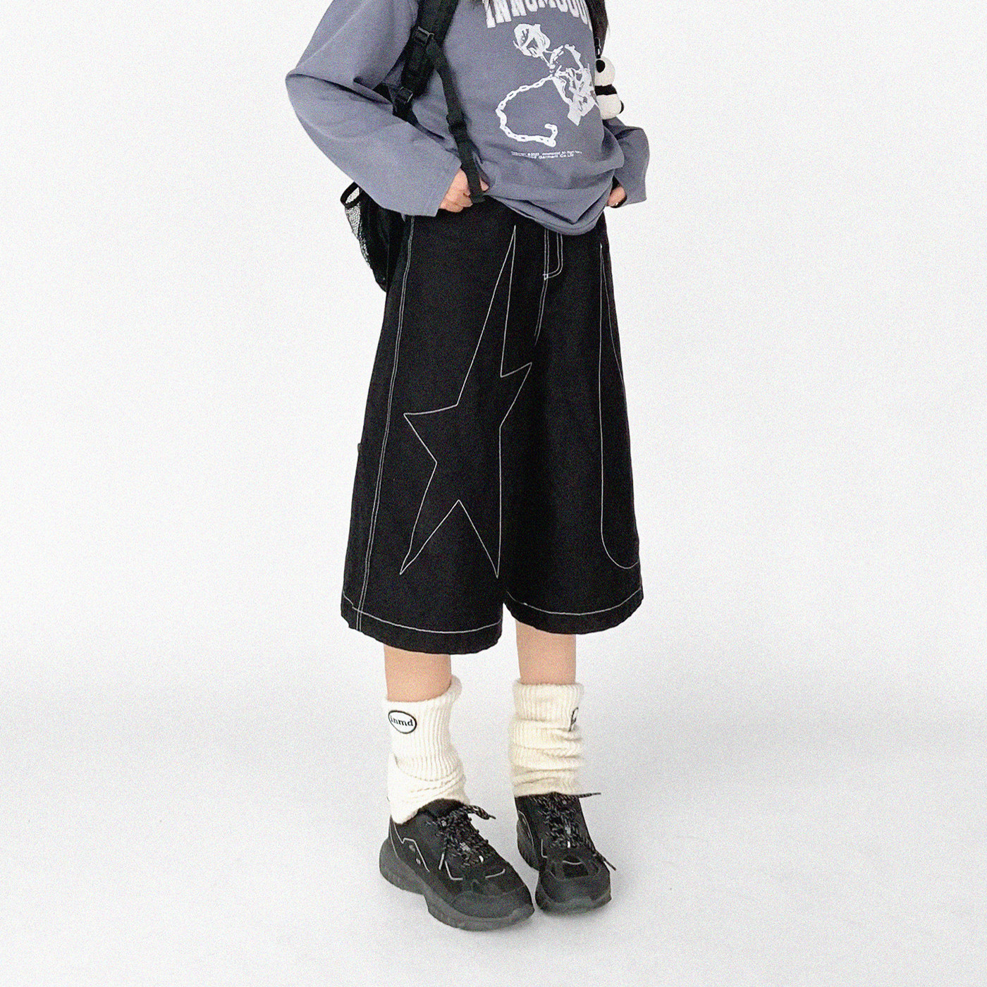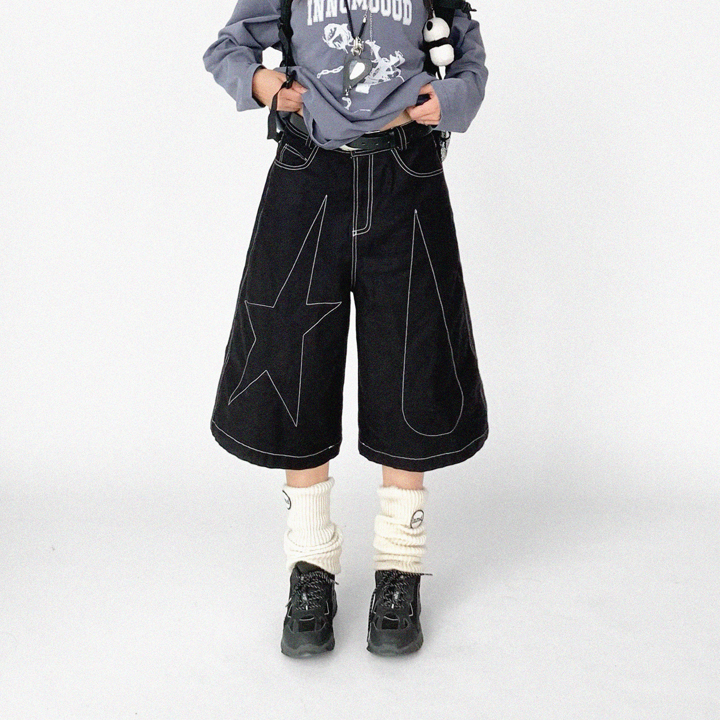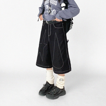 innomoood “tears star”黑色撞色线七分阔腿裤中裤A型无性别