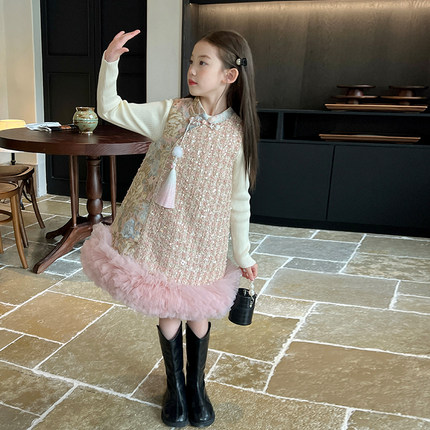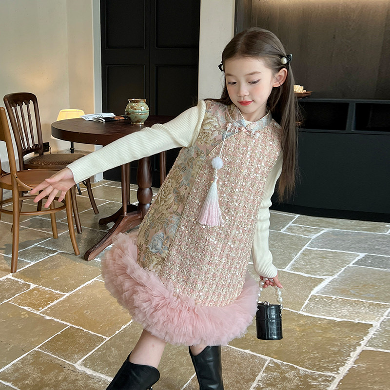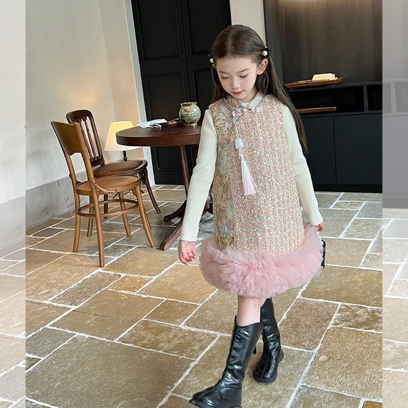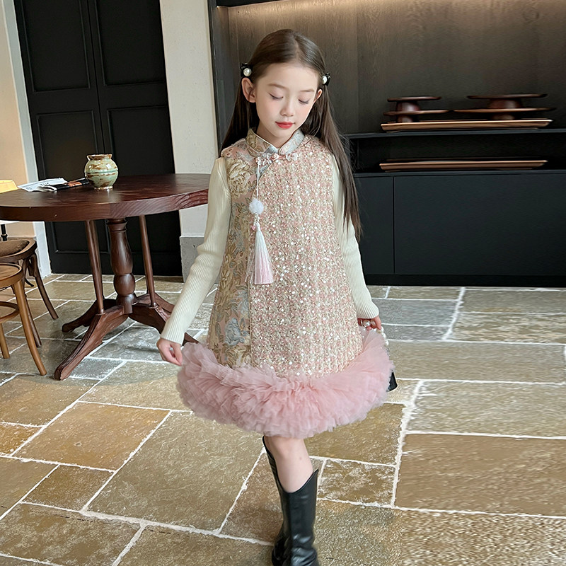 栀了成长记童装女童中国风亮片夹棉旗袍裙冬儿童宝宝背心裙连衣裙
