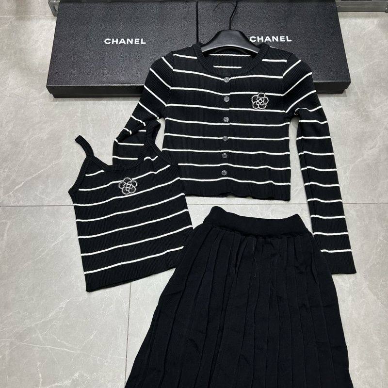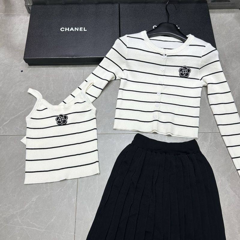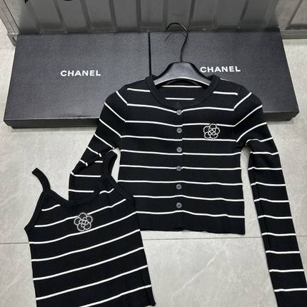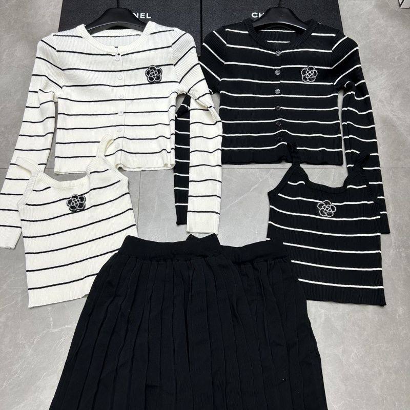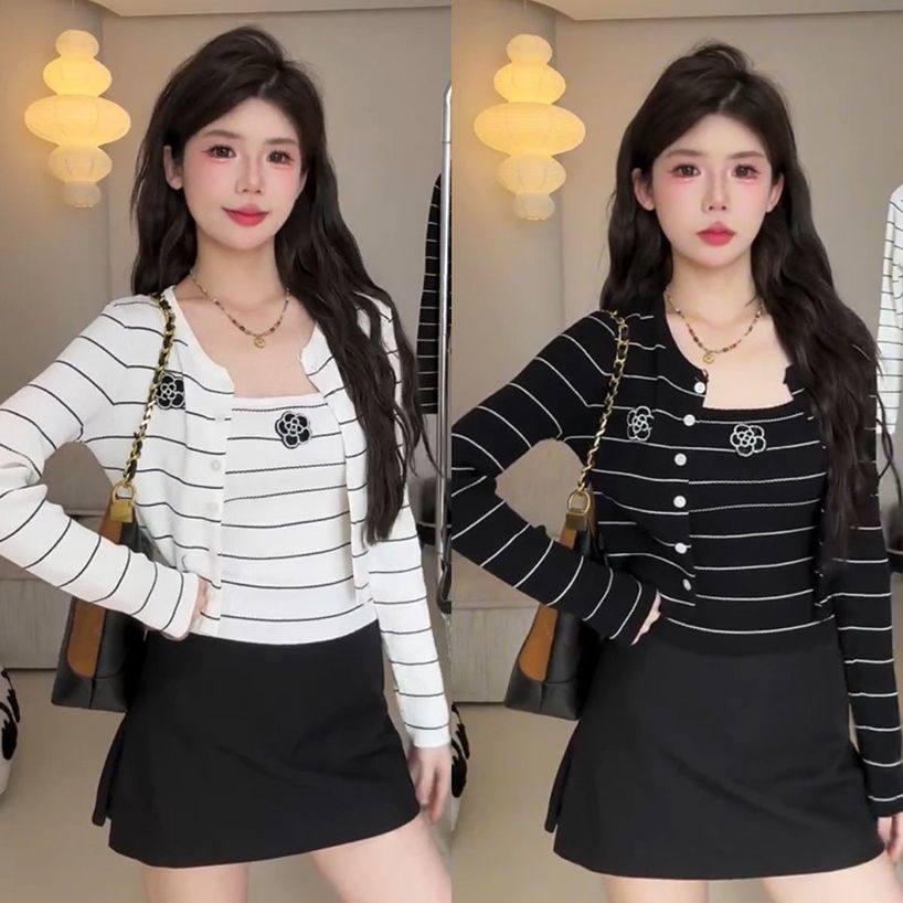 秋季新款女条纹山茶花针织开衫女长袖圆领单排扣毛衣外套时尚套装