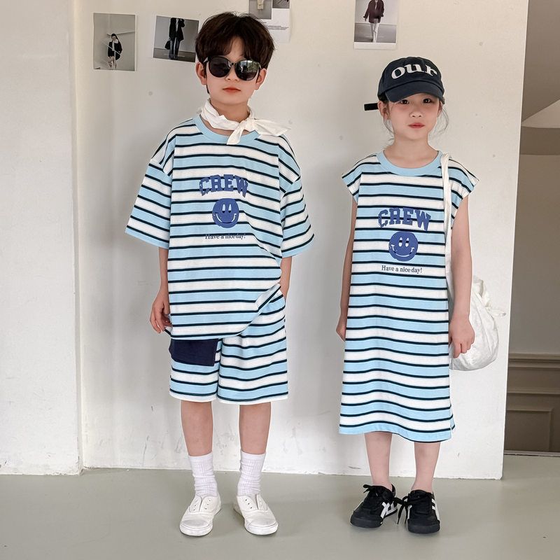 圆领2025韩版套装短裤字母条纹连衣裙儿童夏季短袖童两件套男女童