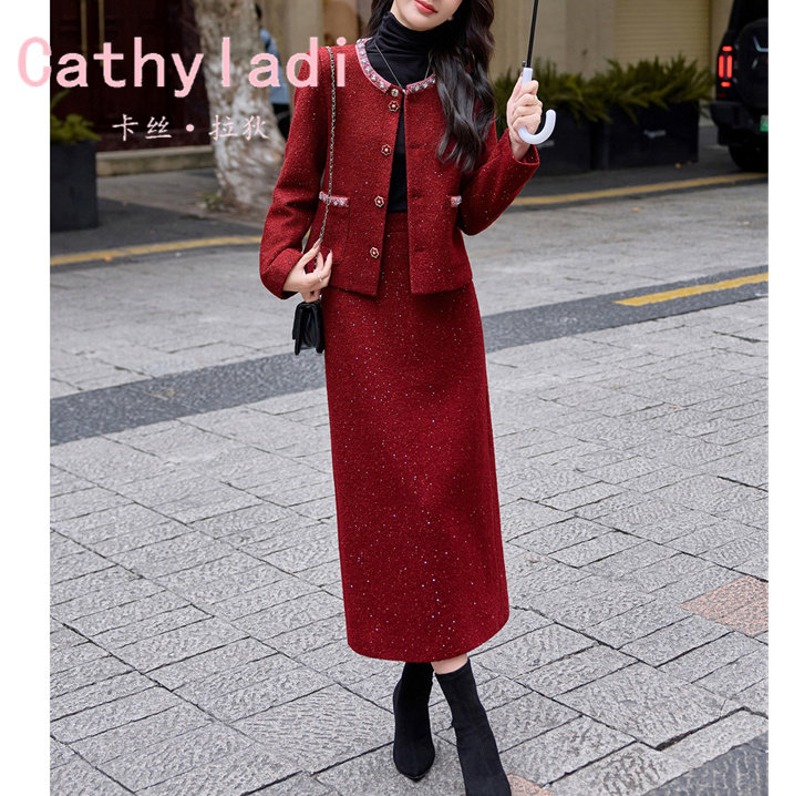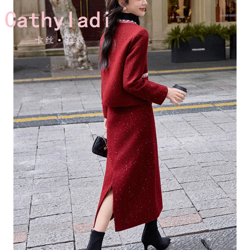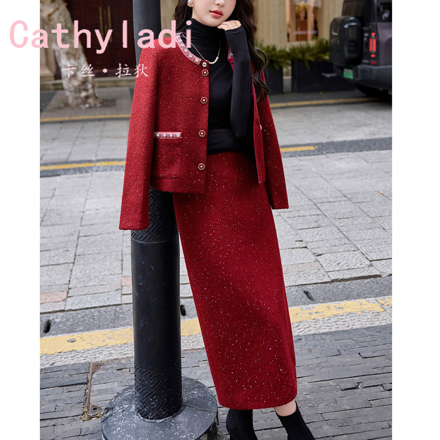 CATHYLADI优雅小香风时尚套装2025秋冬红色气质外套半身裙两件套