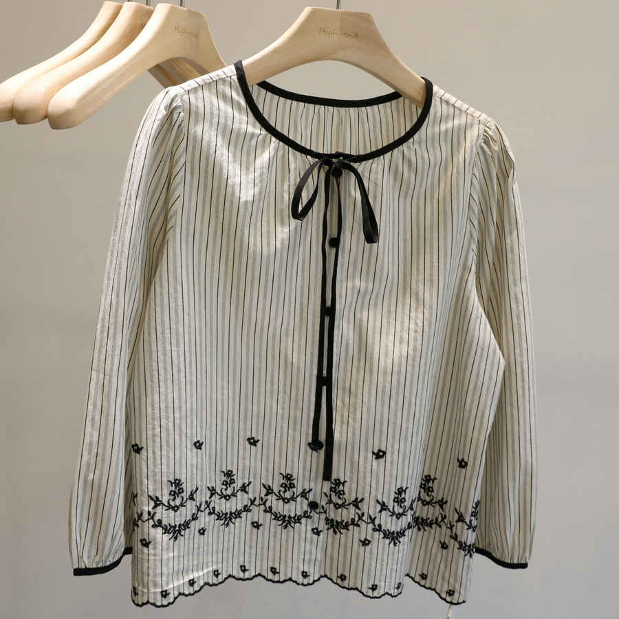 韩系博主范~条纹绣花长袖衬衫女2025秋新款宽松显瘦圆领系带小衫