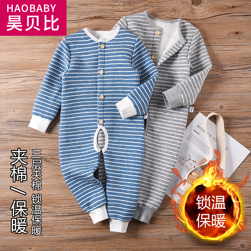 婴儿三层夹棉连体衣宝宝保暖哈衣开裆秋冬款秋天外出服大码连身衣