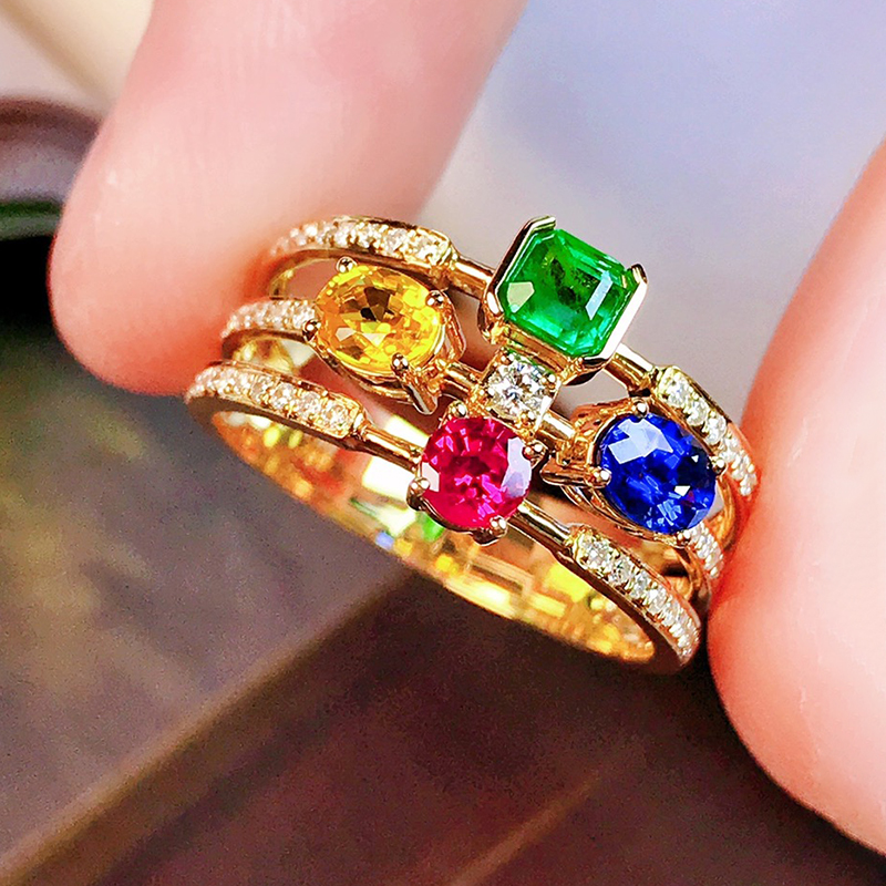 宝创集18K金1克拉天然红蓝宝祖母绿黄蓝宝多宝戒指钻石彩宝女戒