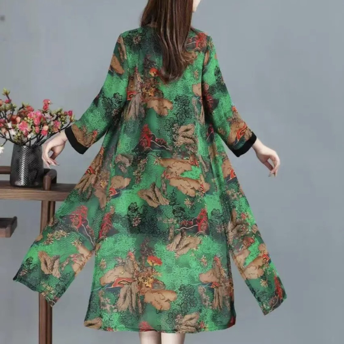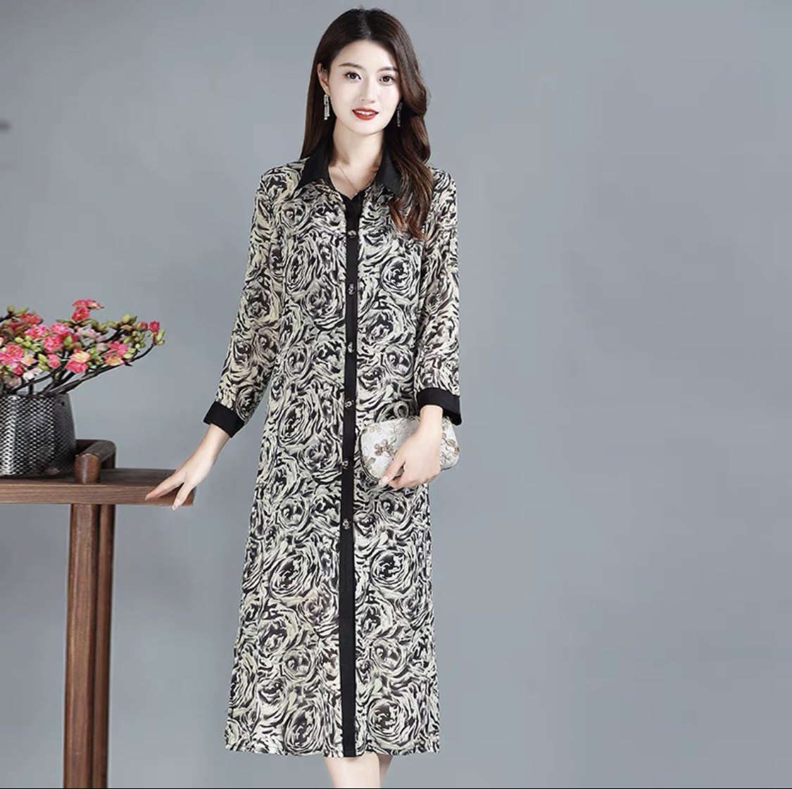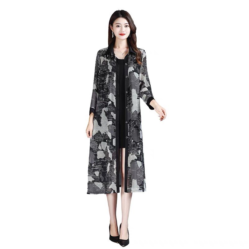 中年妈妈七分袖上衣雪纺衬衫夏装新款防晒衣女印花薄款长外套大码
