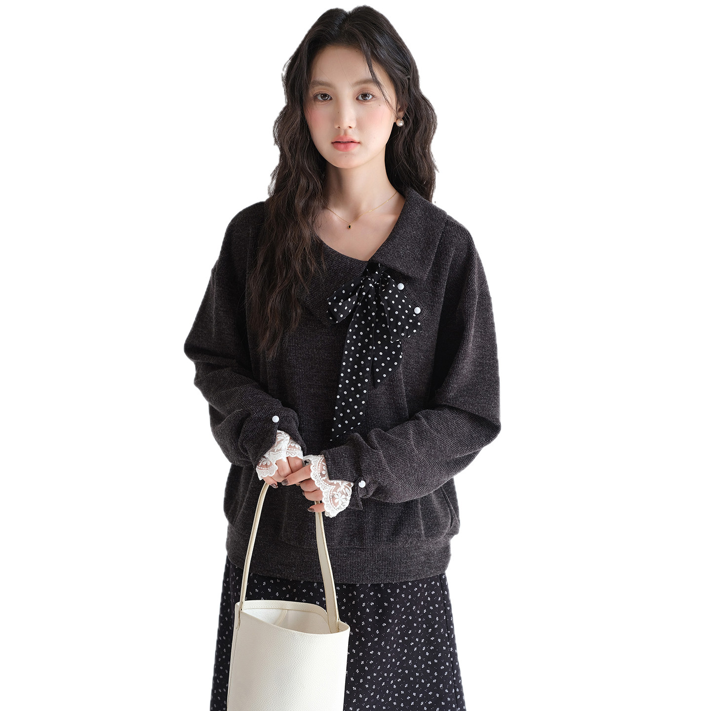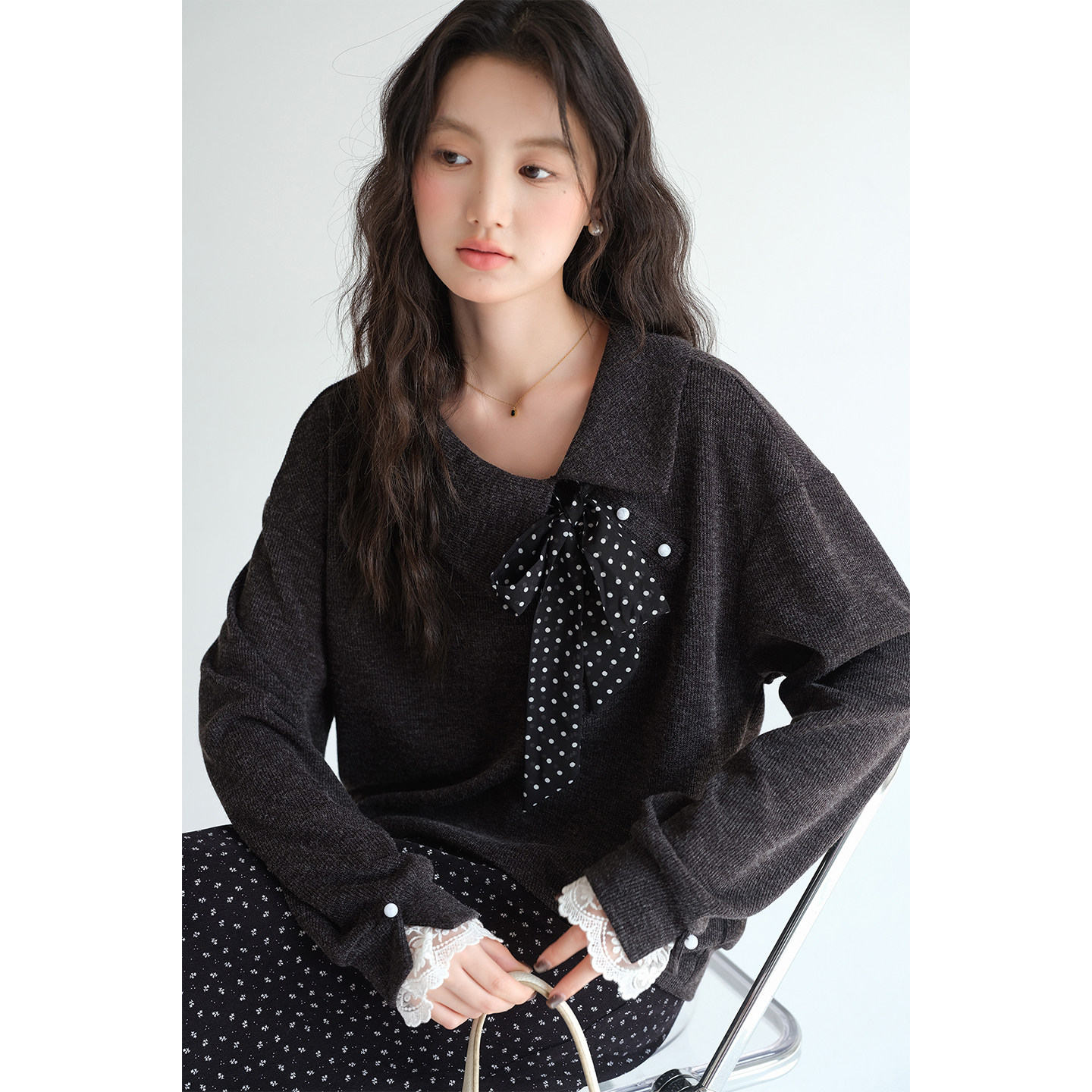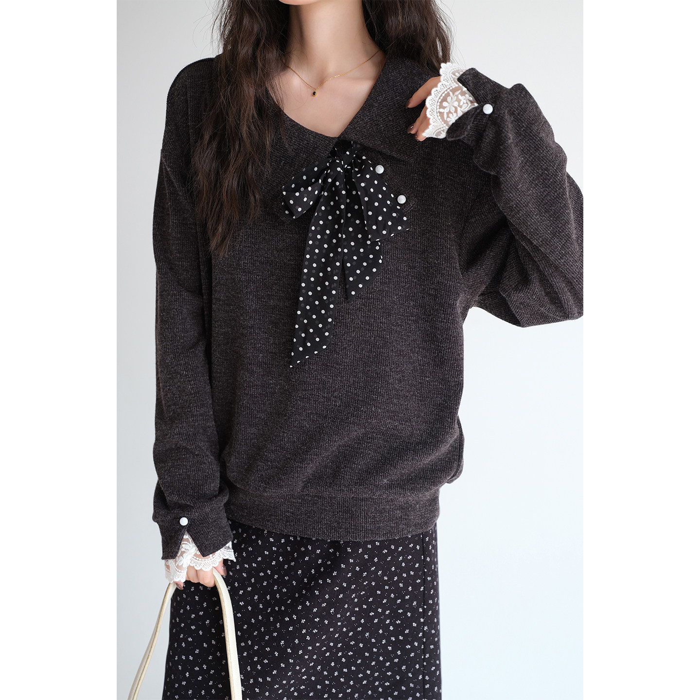 蓝若水大码女装波点蝴蝶结翻领针织衫2026春新款蕾丝拼接宽松上衣