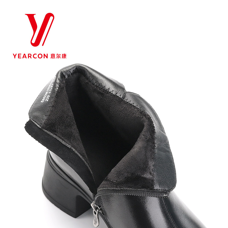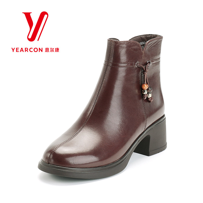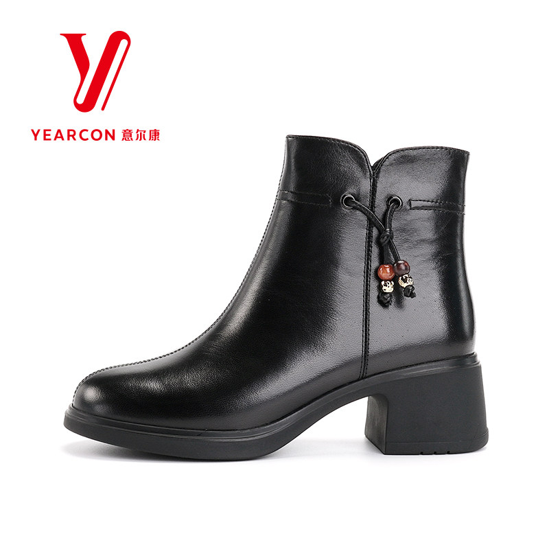 意尔康女靴2025新款冬季真皮短靴女粗跟通勤靴子妈妈靴加绒棉靴
