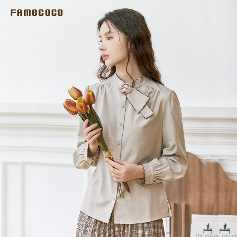 Famecoco范可儿优雅通勤条巾领衬衫刺绣花边领长袖衬衣F228BA003