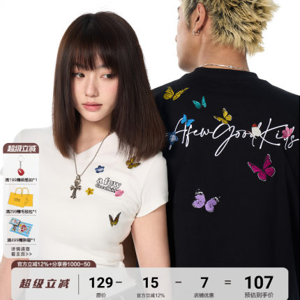 AFGK25SS环绕蝴蝶刺绣短袖夏季V领正肩显瘦修身T恤男女情侣装上衣