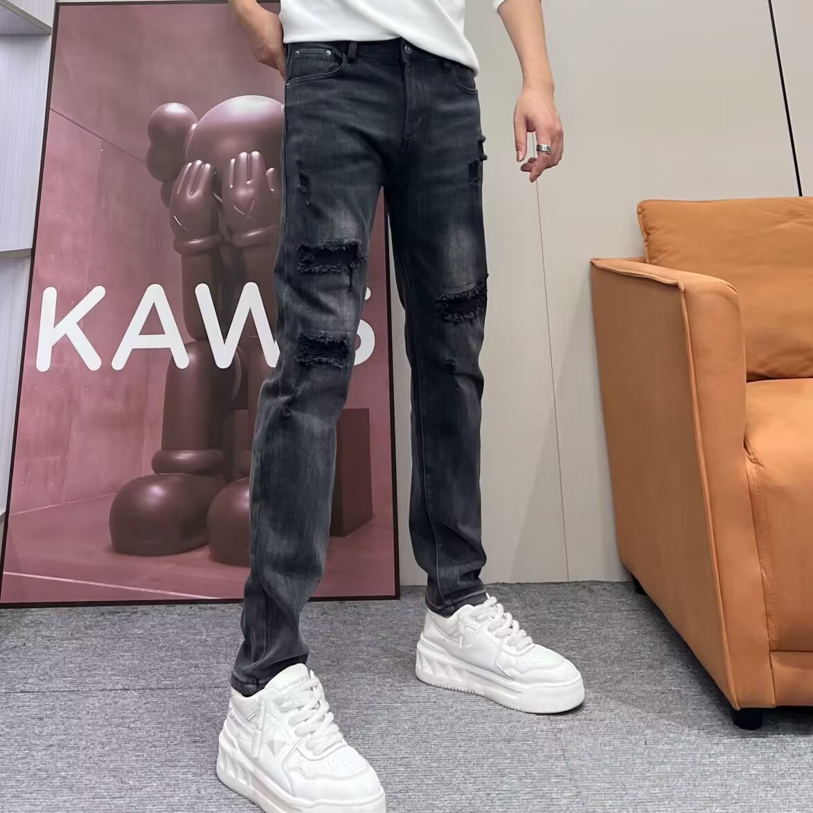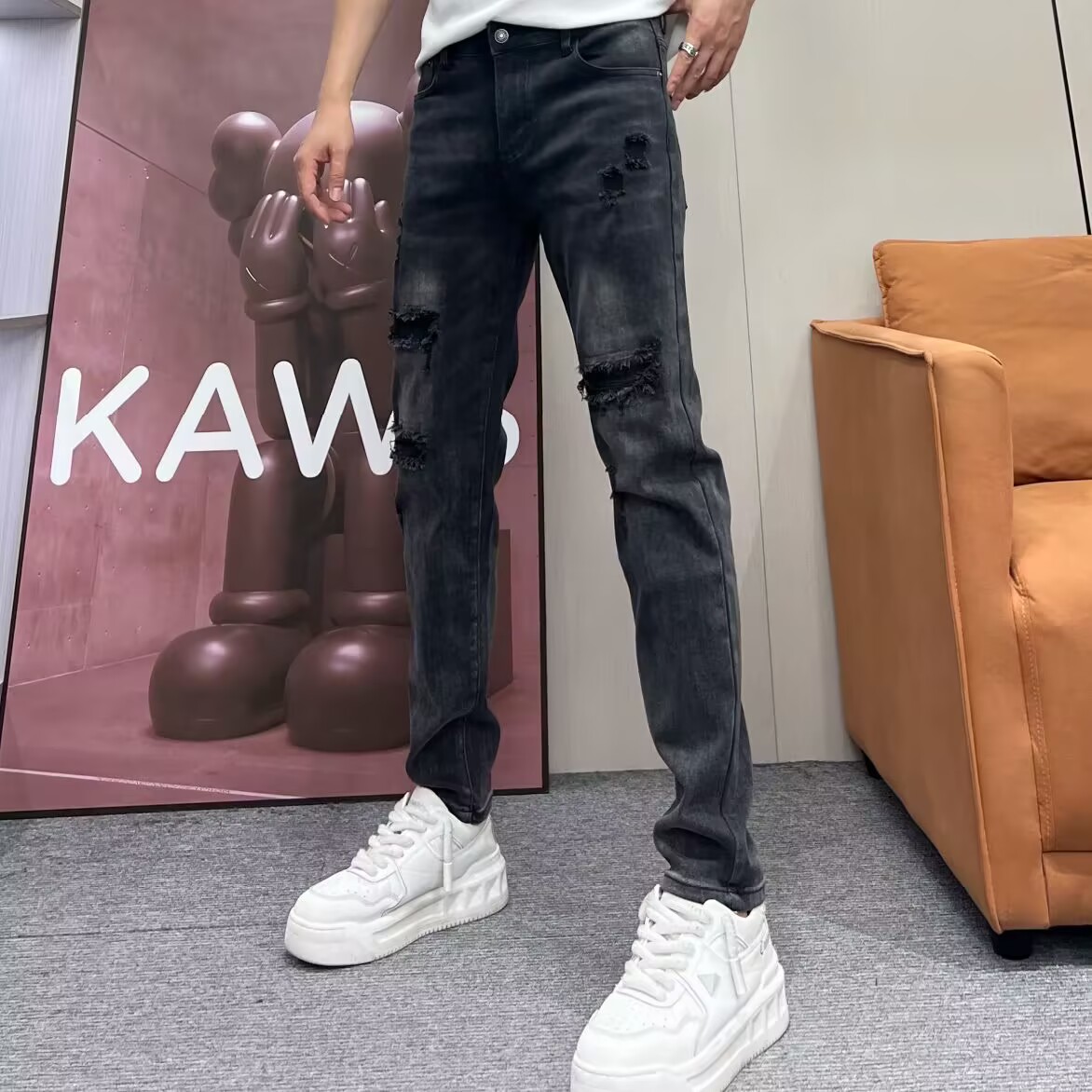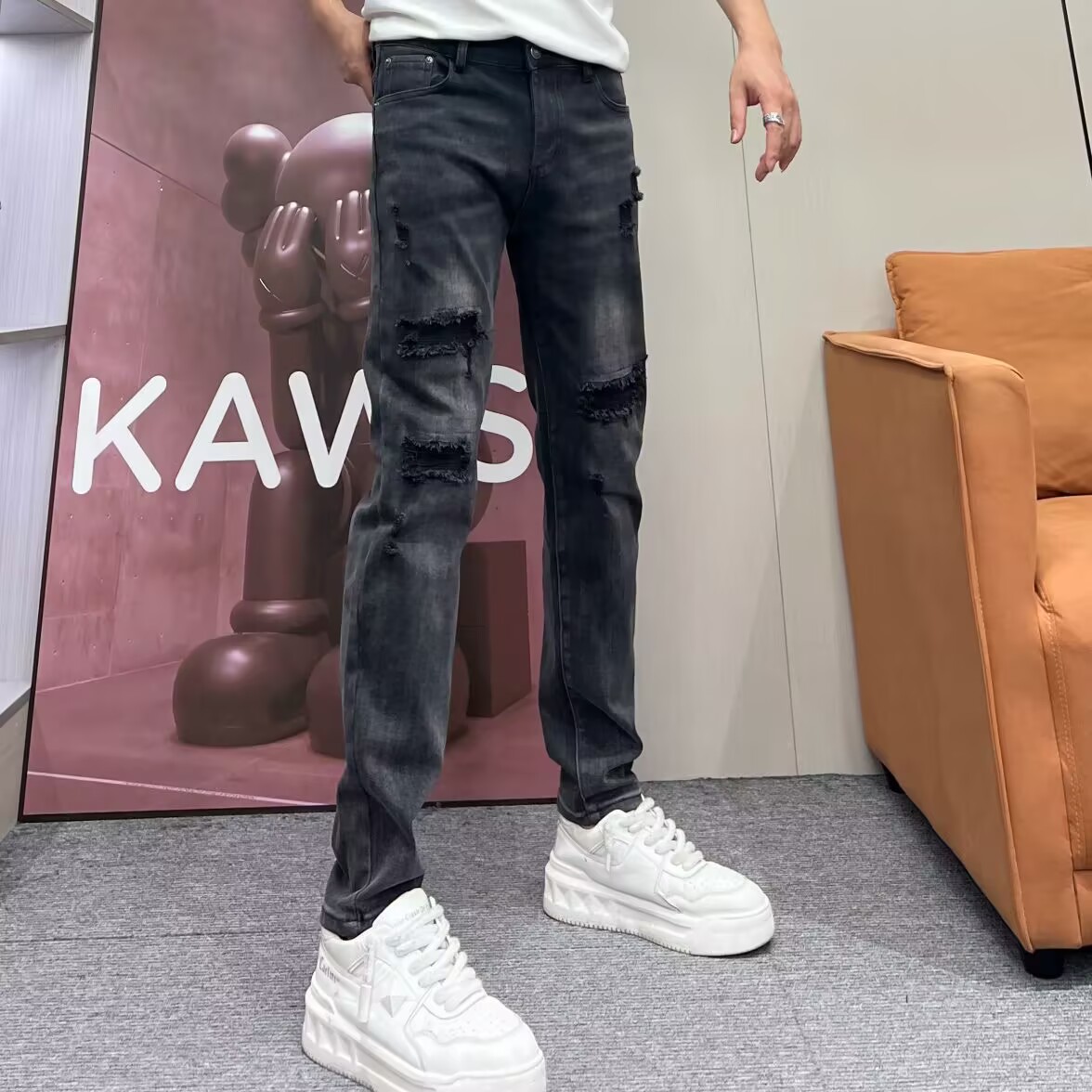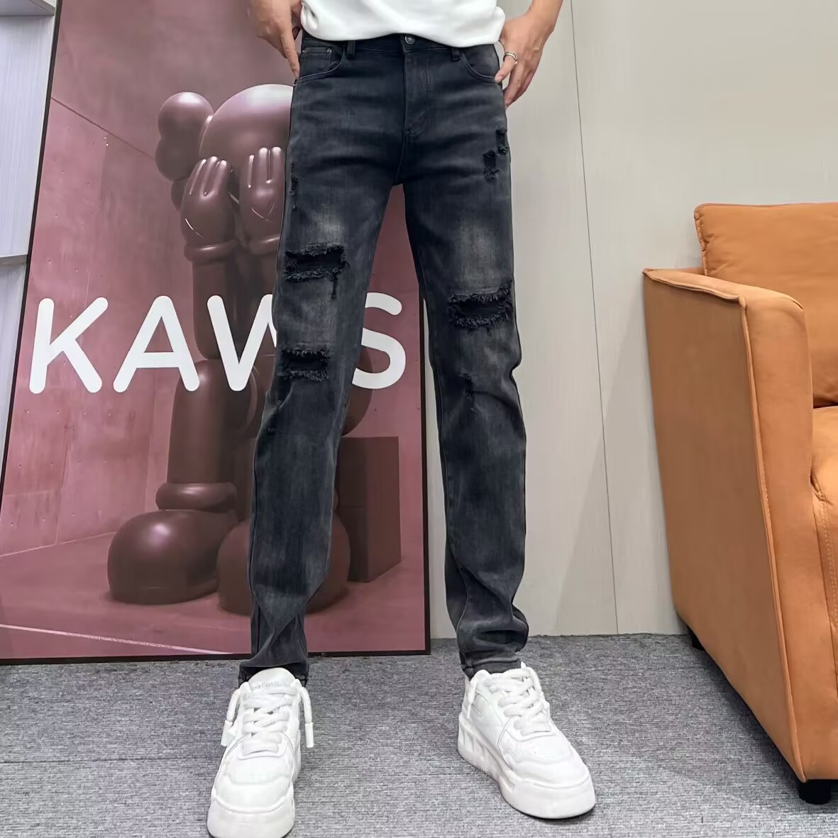 高端黑灰色牛仔裤男破洞补丁2025秋冬季新款复古弹力修身小脚裤潮
