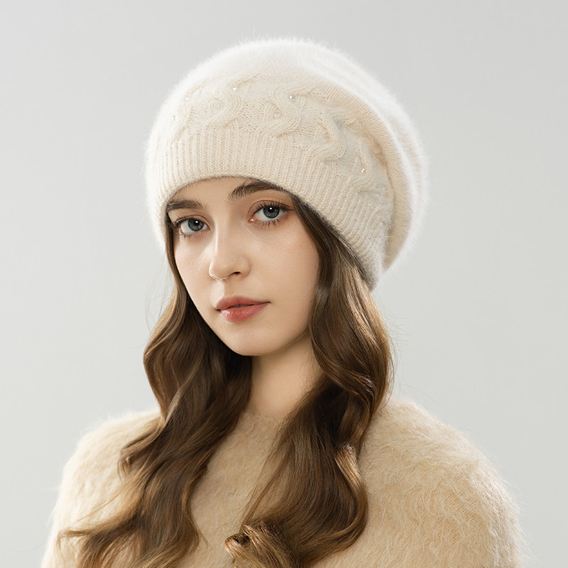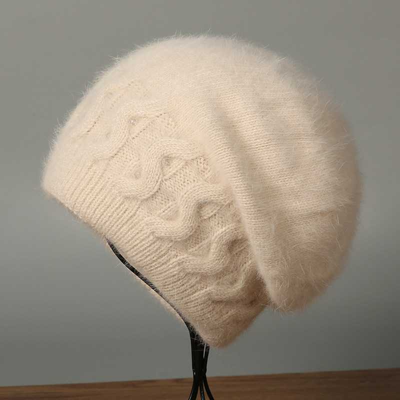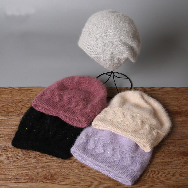 秋冬季女士兔毛针织双层贝雷帽麻花编织纹理毛线款保暖防风包头帽