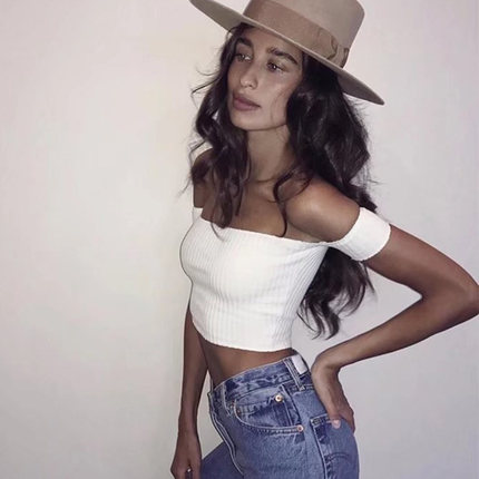 欧美新品一字领露肩螺纹针织衫高腰露脐短款短袖打底衫T恤上衣女