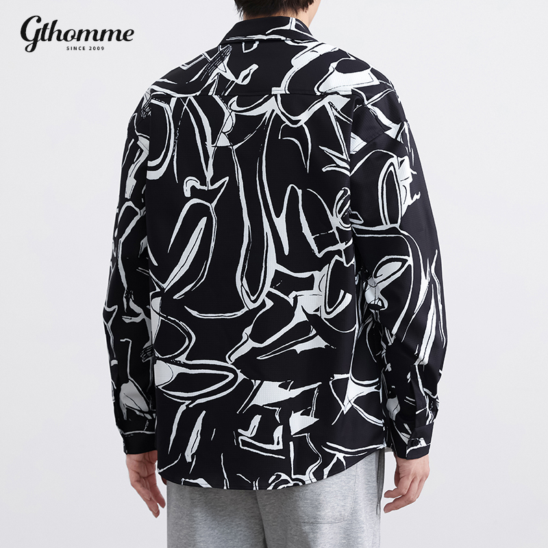 春秋新款衬衫男宽松帅气休闲百搭潮流印花上衣长袖外套衬衣男
