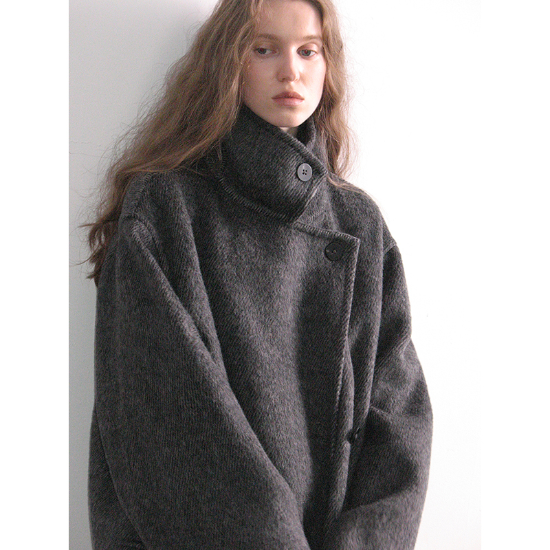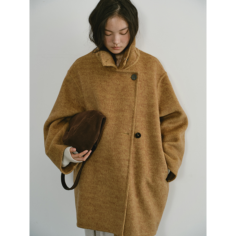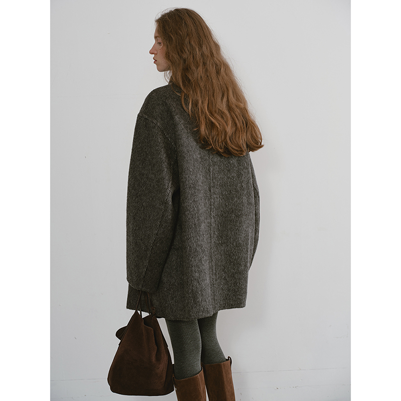 popchrio◆茧型加厚立翻领驼绒羊毛双面呢大衣宽松短款毛呢外套女