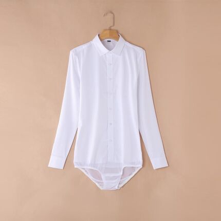男士连体弹力衬衫长袖白色连档衬衣职业工作装跳舞舞蹈表演连内裤